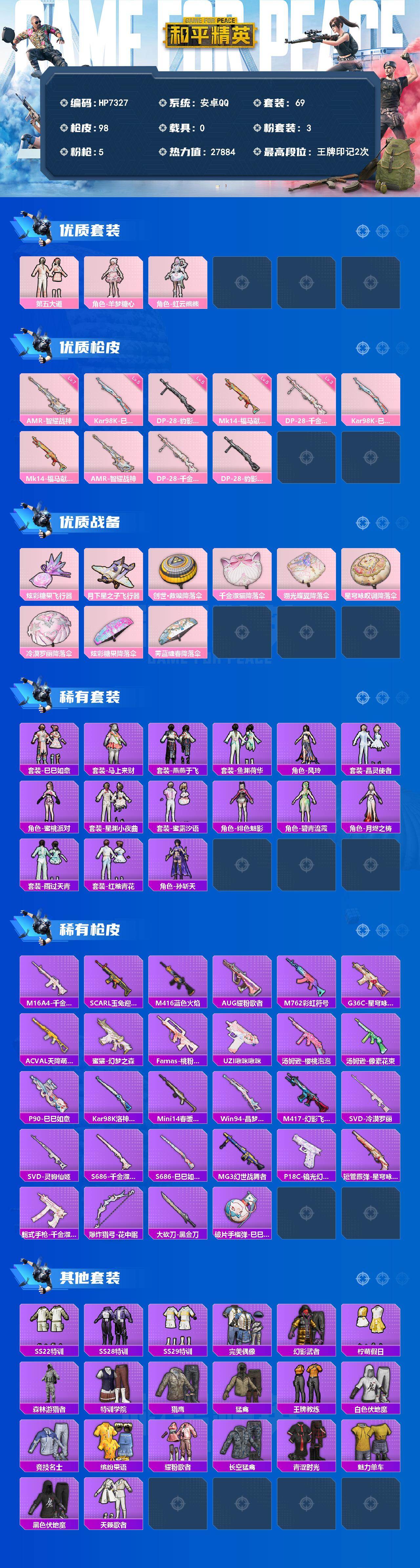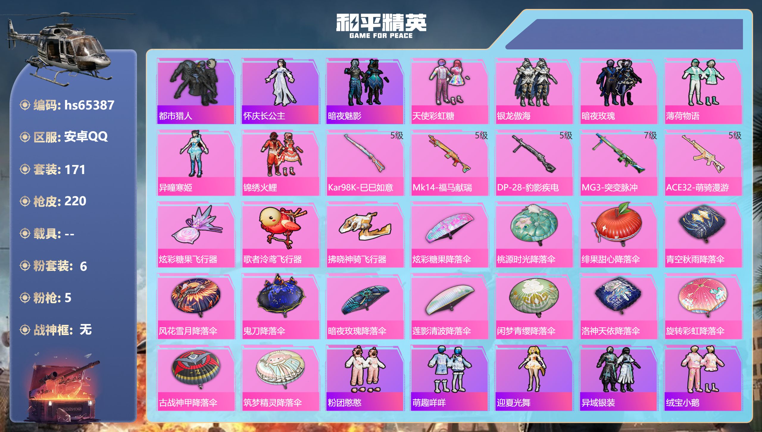 安卓 手Q-3粉装-7特效枪-0载具-1粉色飞行器-34988热力值-6王牌印