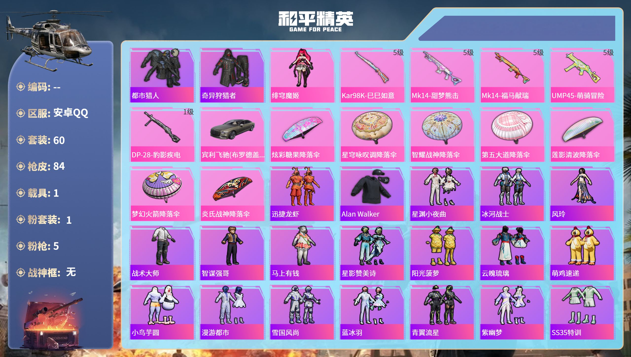 安卓 手Q-3粉装-5特效枪-1载具-1粉色飞行器-32664热力值-4王牌印