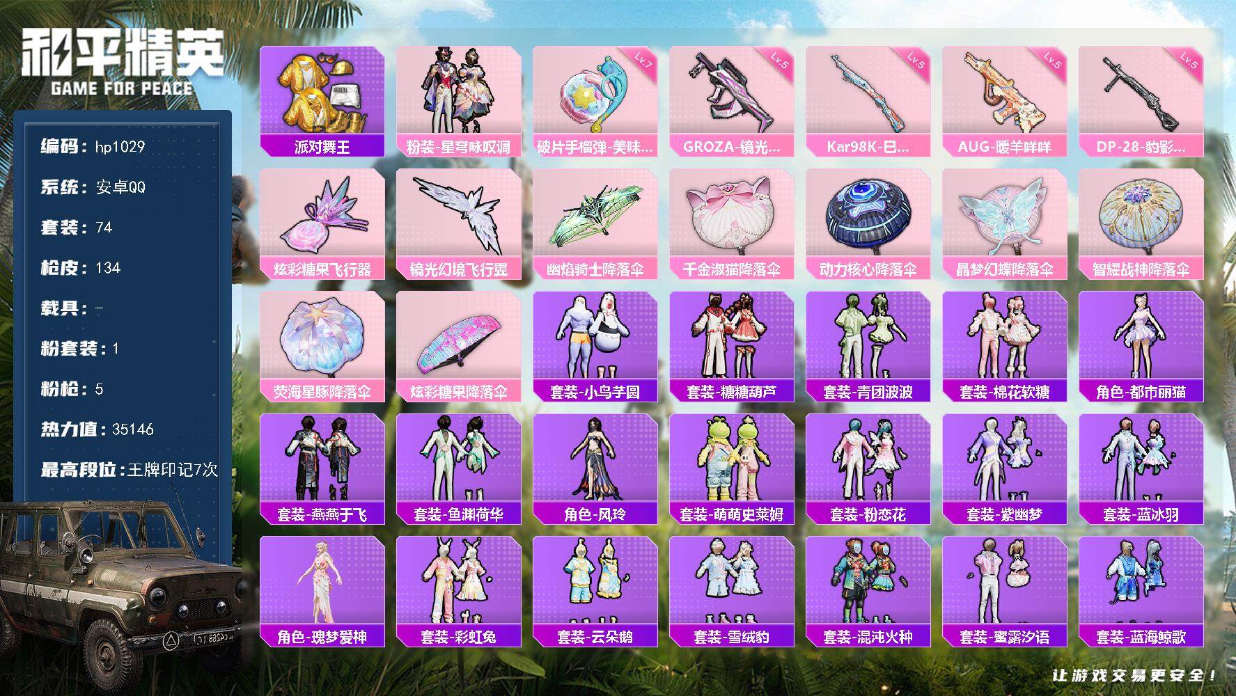 安卓 手Q-1粉装-6特效枪-0载具-0粉色飞行器-53835热力值-9王牌印