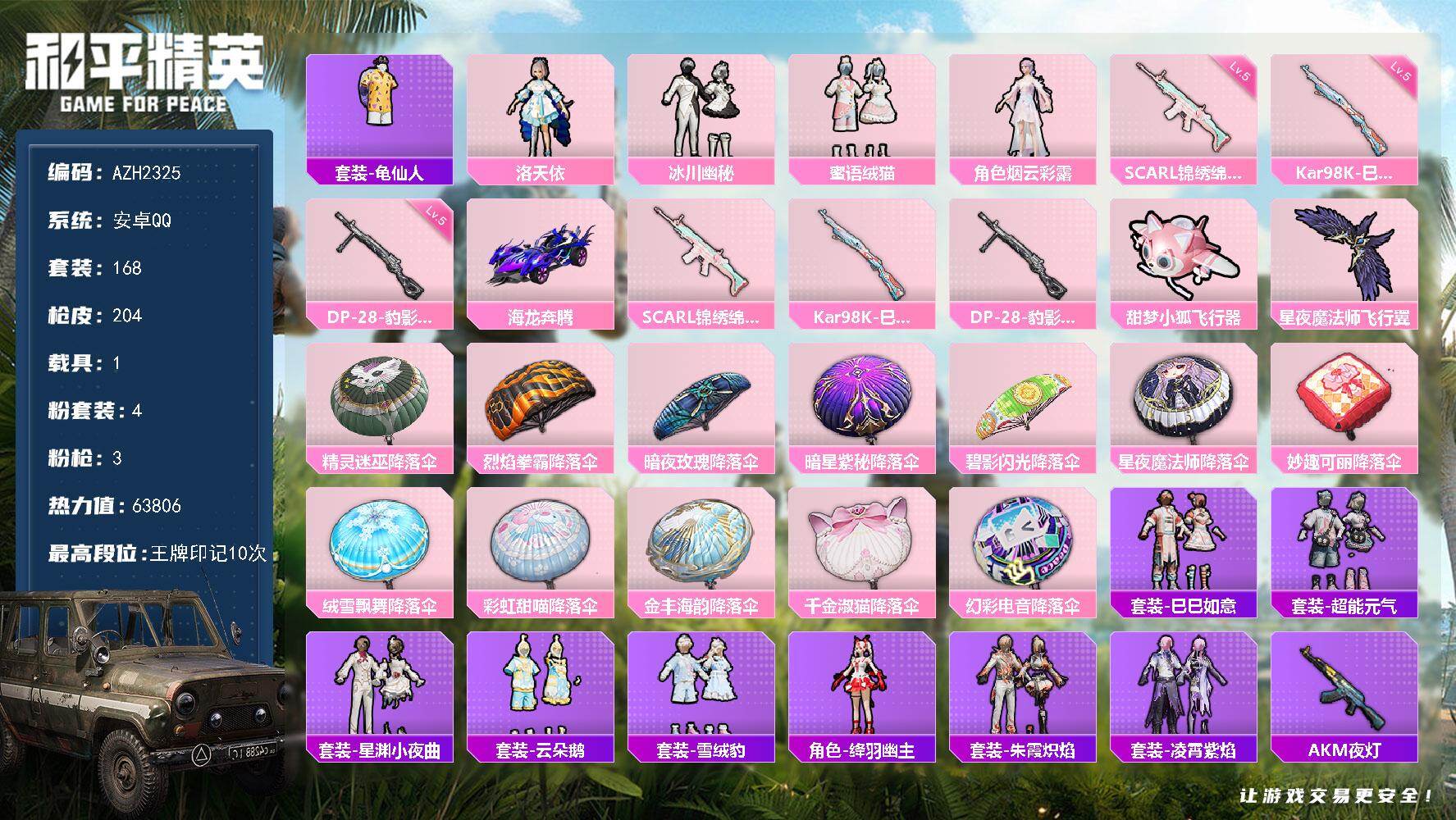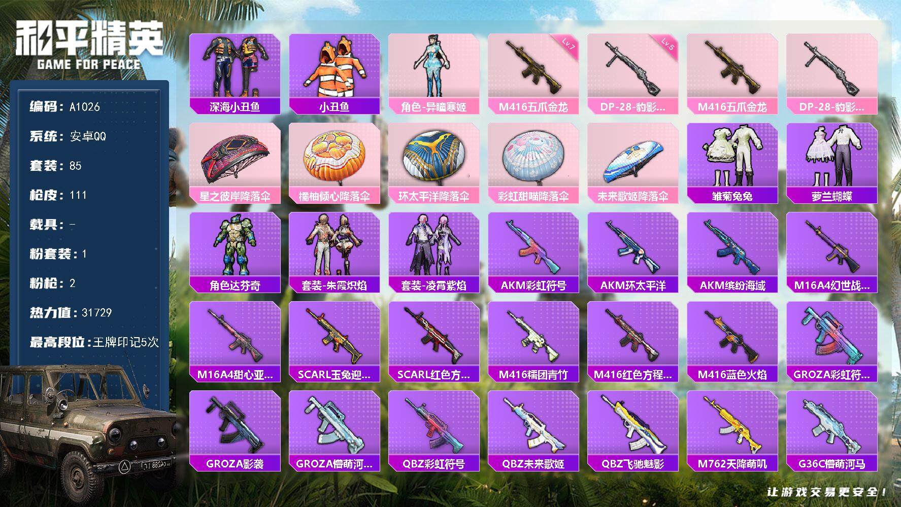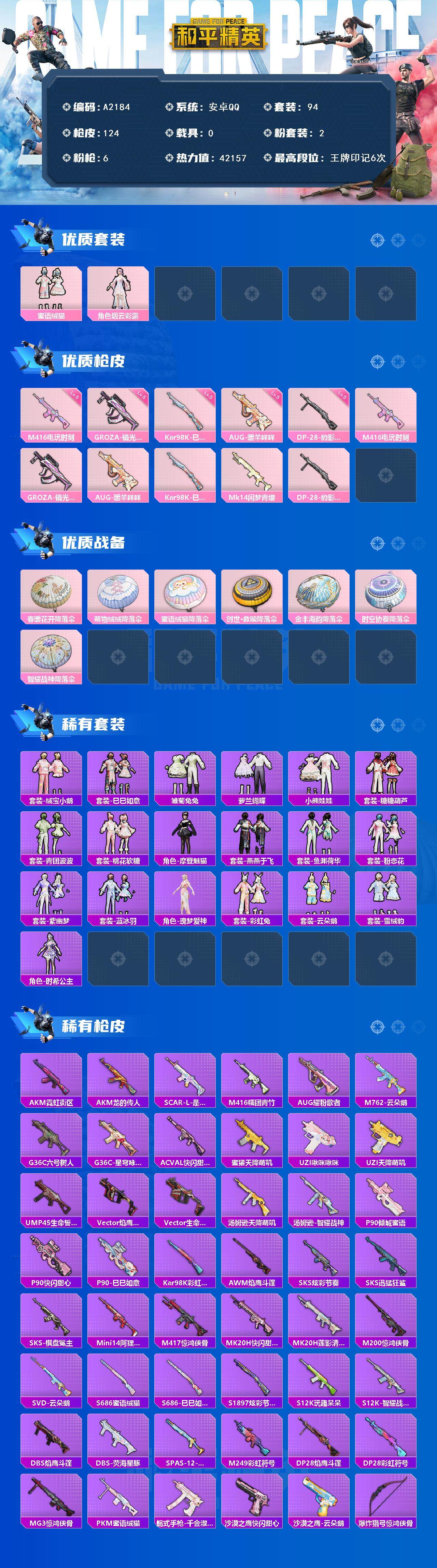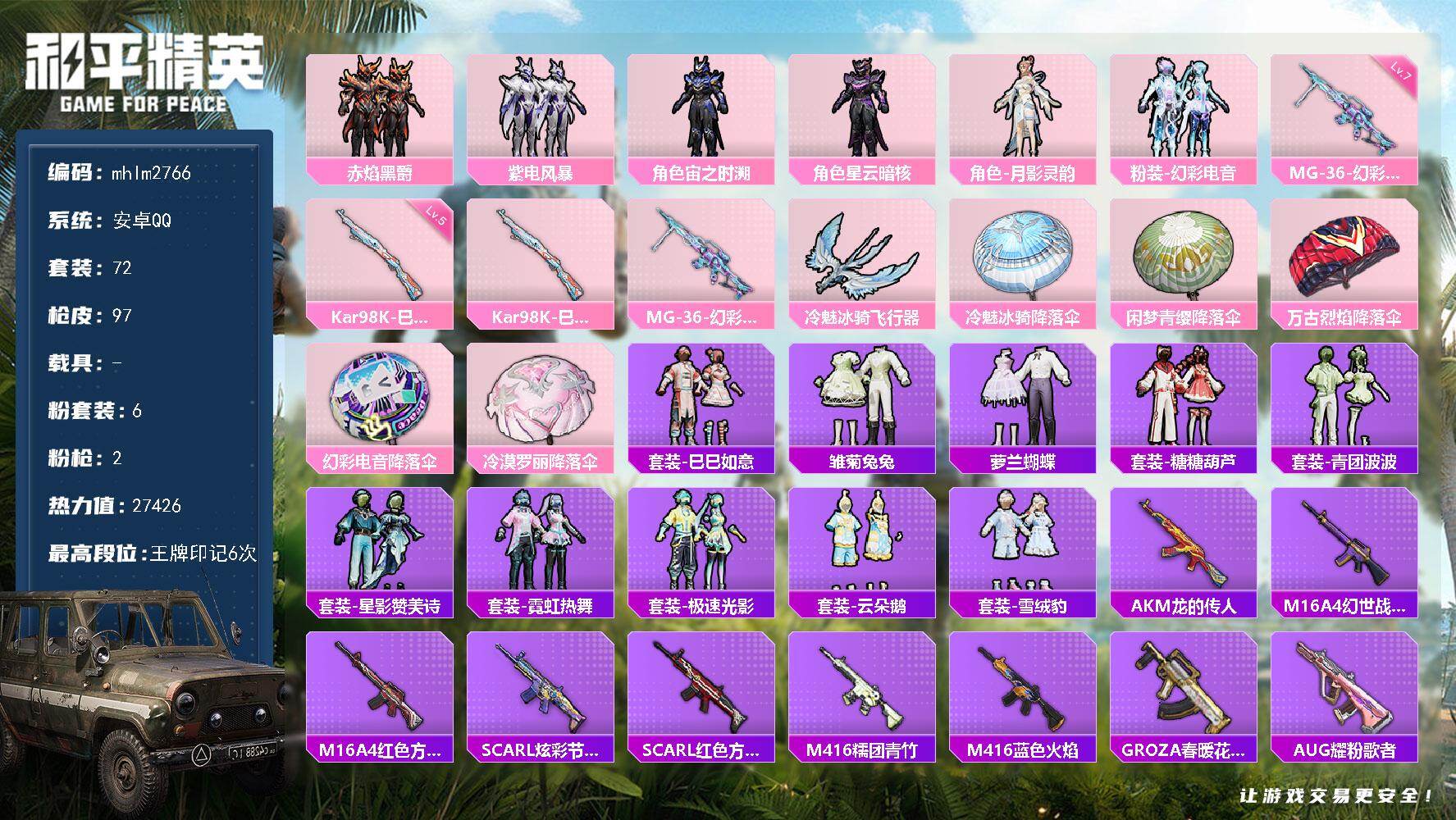 hs50385 安卓手Q-6王牌印记-1粉装-4特效枪-1载具-43651热力值-96套装-137枪