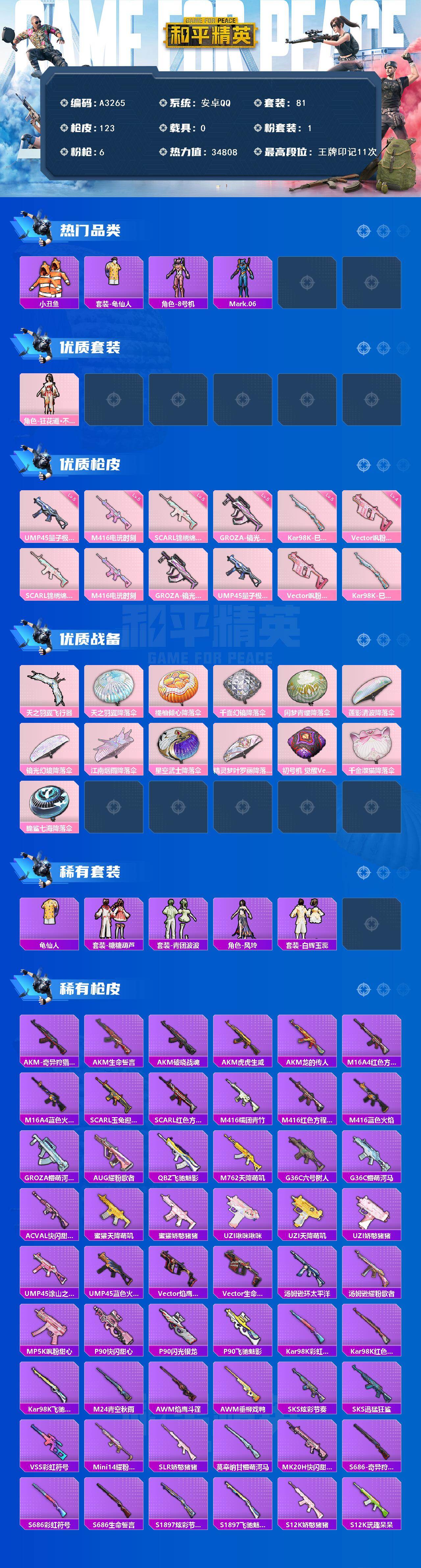 hs46988 安卓手Q-10王牌印记-2粉装-7特效枪-0载具-36727热力值-75套装-118