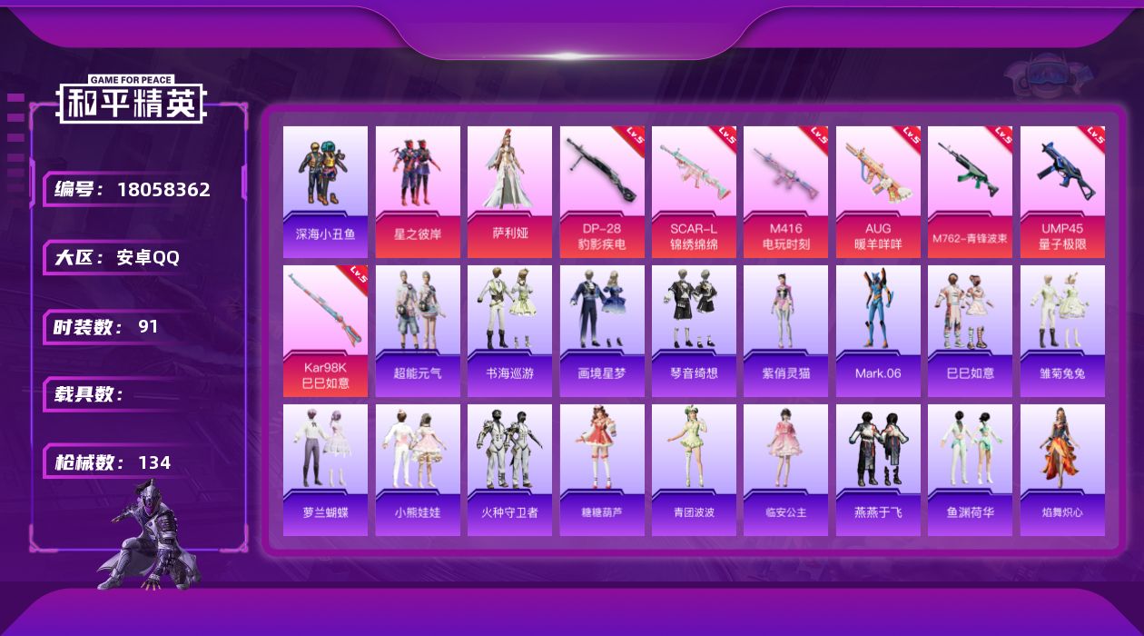 实名: 可修改 时装数: 413 载具数: 2 枪械数: 108 战备数: 8