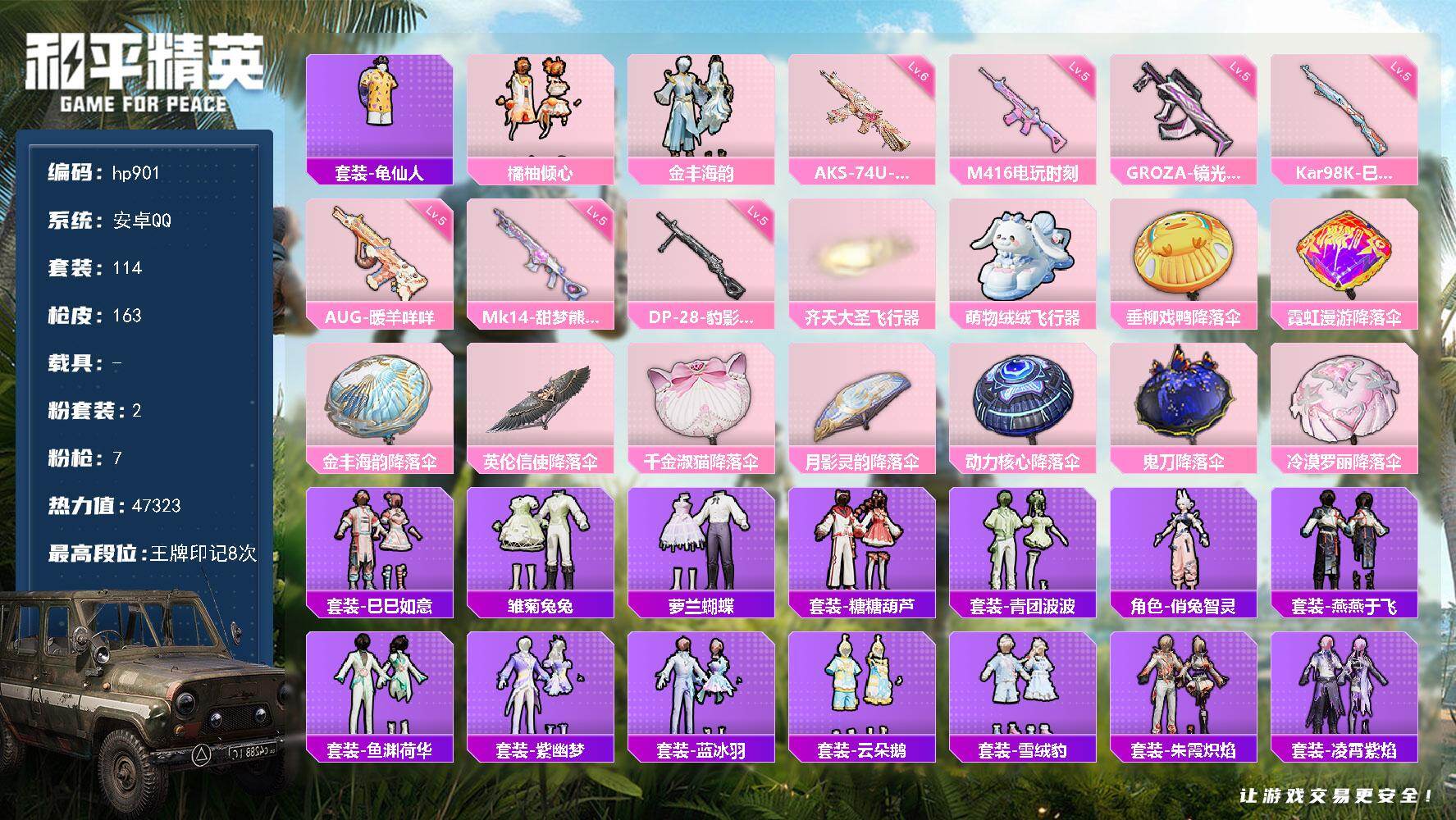 2粉装-7特效枪-0载具-2粉色飞行器-47323热力值-8王牌印记-114套装-163枪皮