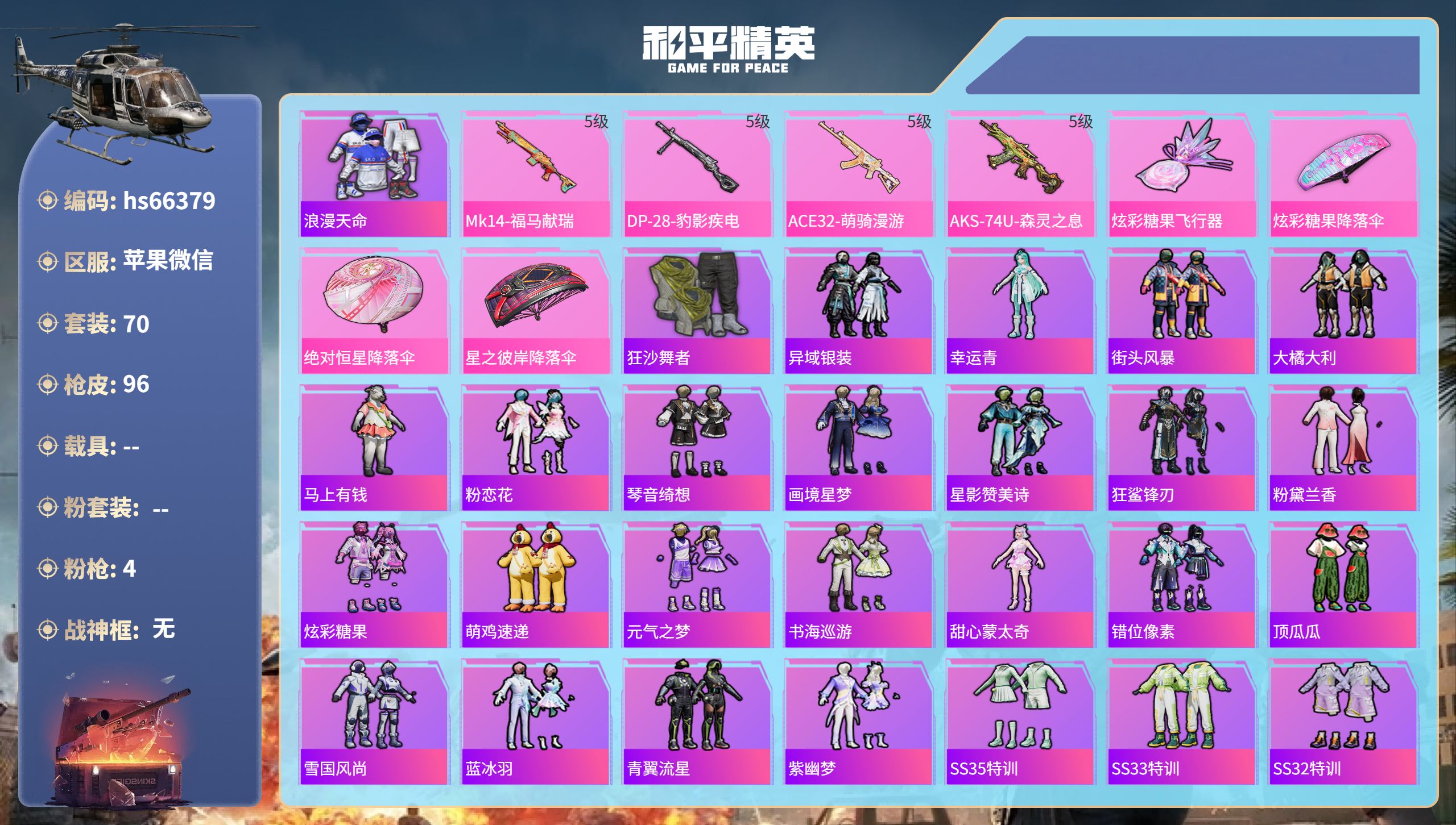 安卓微信-2王牌印记-2粉装-4特效枪-28722热力值-66套