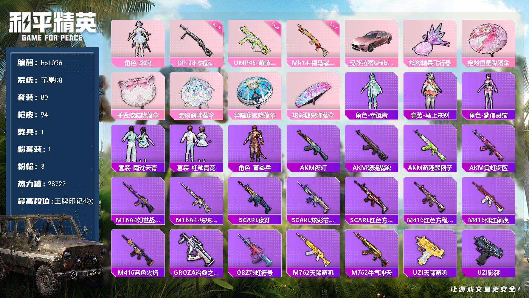 安卓 手Q-4粉装-3特效枪-0载具-3粉色飞行器-31073热力值-3王牌印