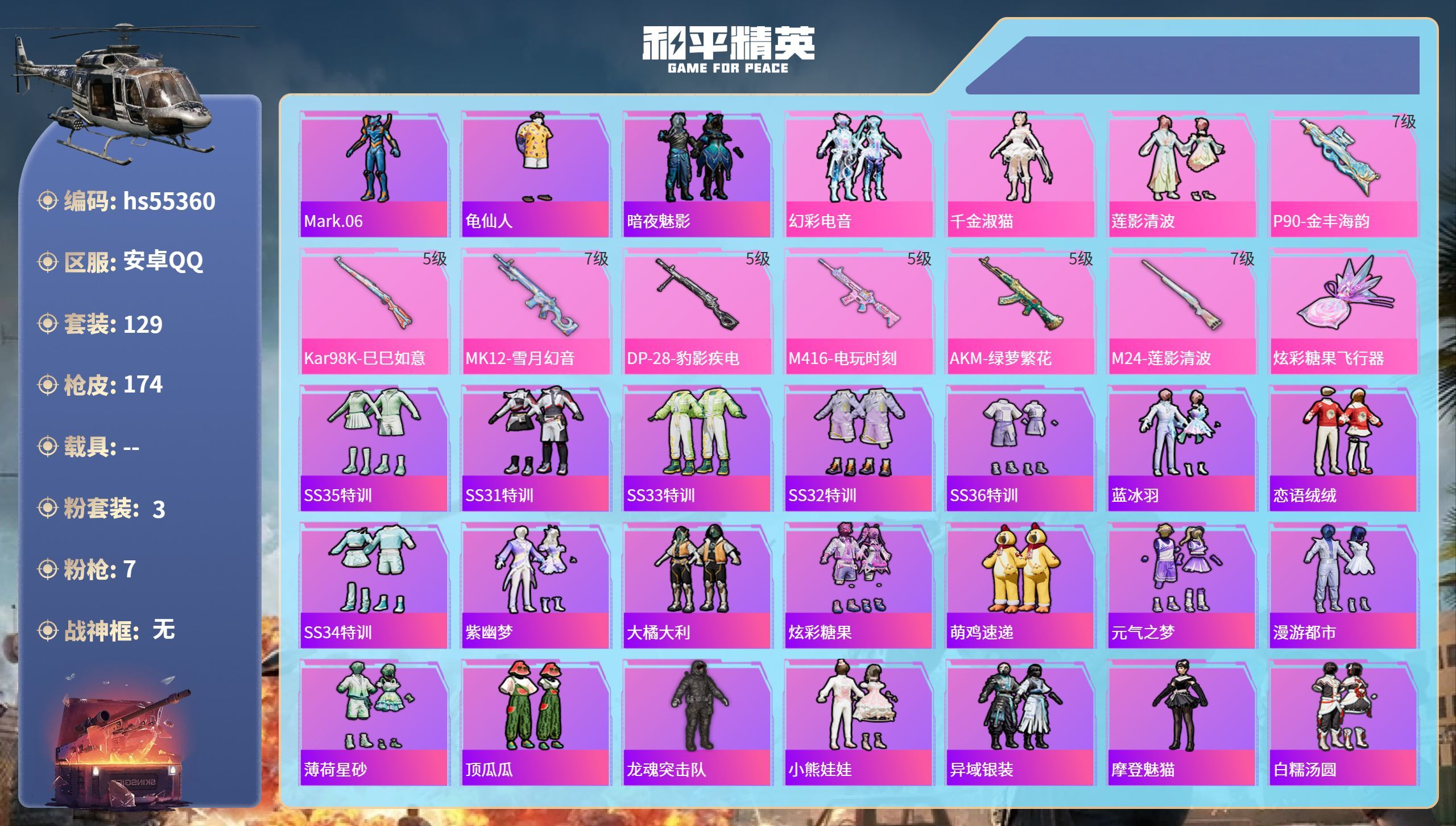 hs55360 安卓手Q-12王牌印记-3粉装-7特效枪-50911热力值-129套装-174枪皮-
