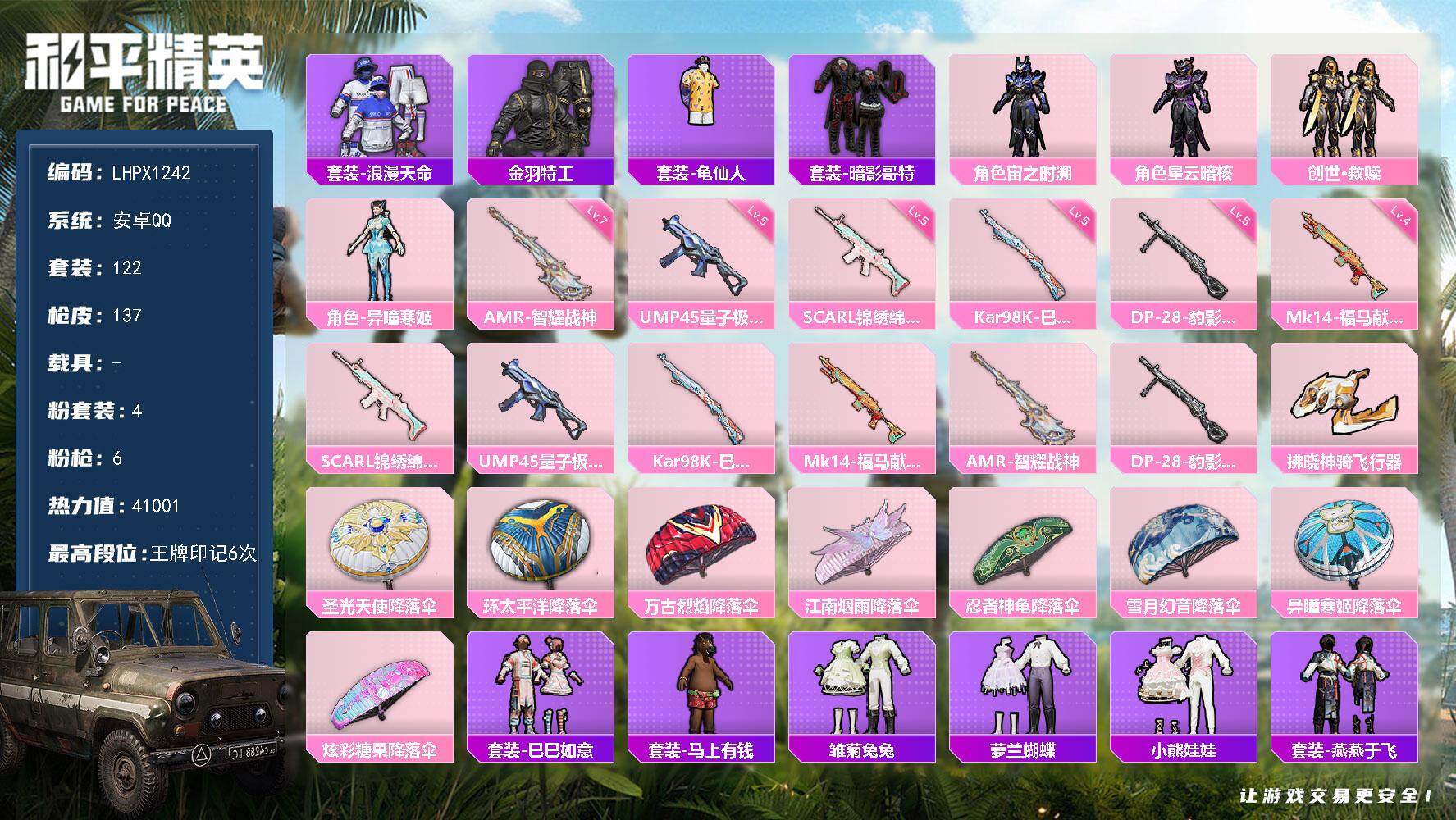 安卓 手Q-3粉装-4特效枪-0载具-4粉色飞行器-52124热力值-7王牌印
