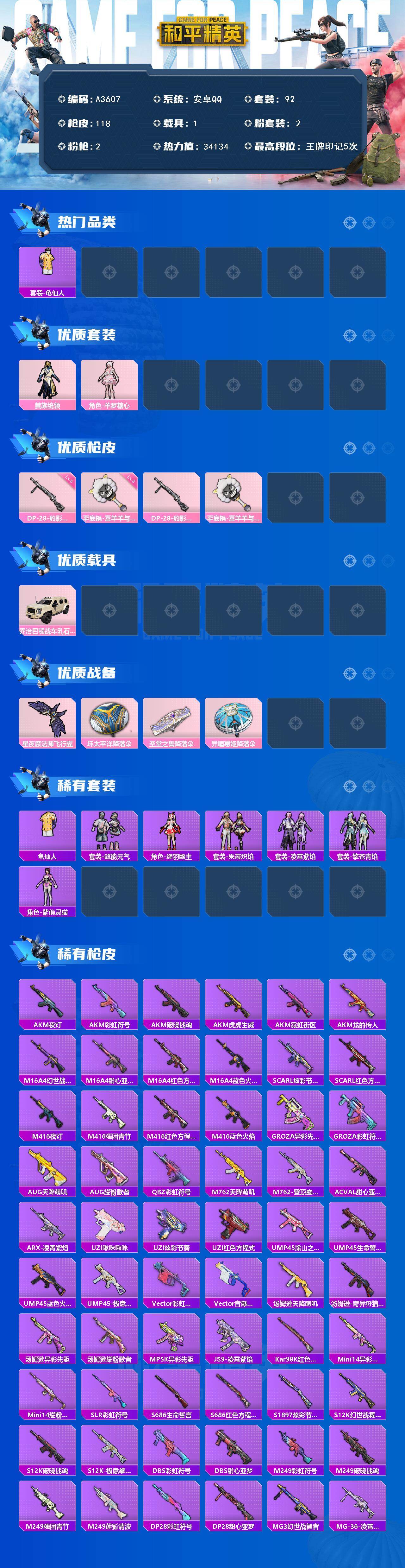 hs54180 安卓手Q-8王牌印记-2粉装-4特效枪-1载具-44265热力值-89套装-138枪