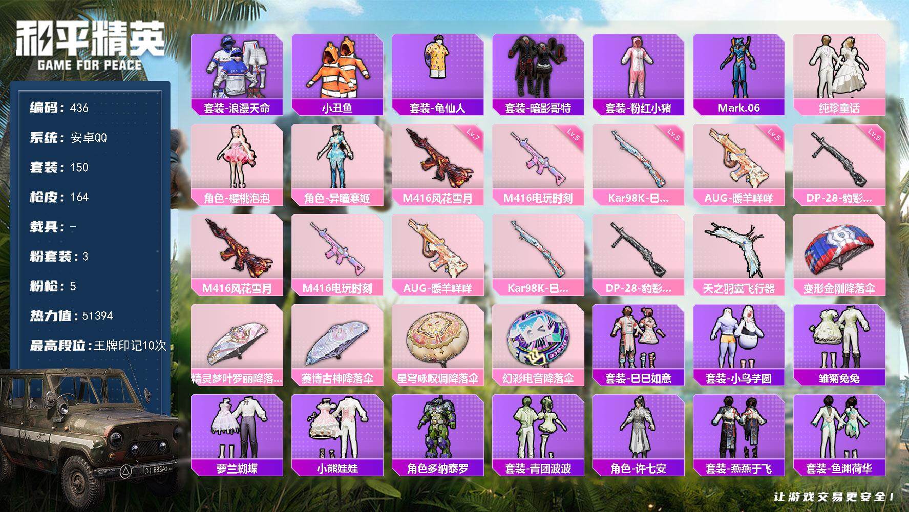 安卓 手Q-3粉装-5特效枪-0载具-2粉色飞行器-51394热力值-10王牌
