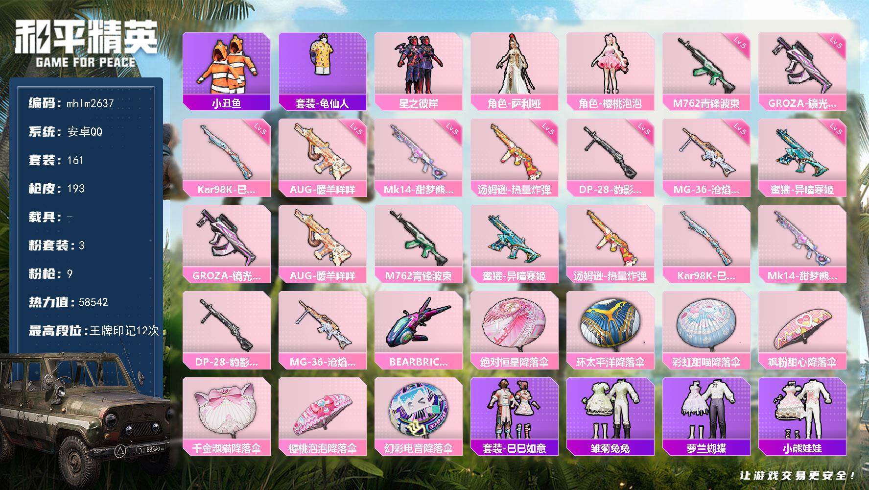 hs54662 苹果手Q-4王牌印记-3粉装-2特效枪-1载具-32422热力值-74套装-102枪