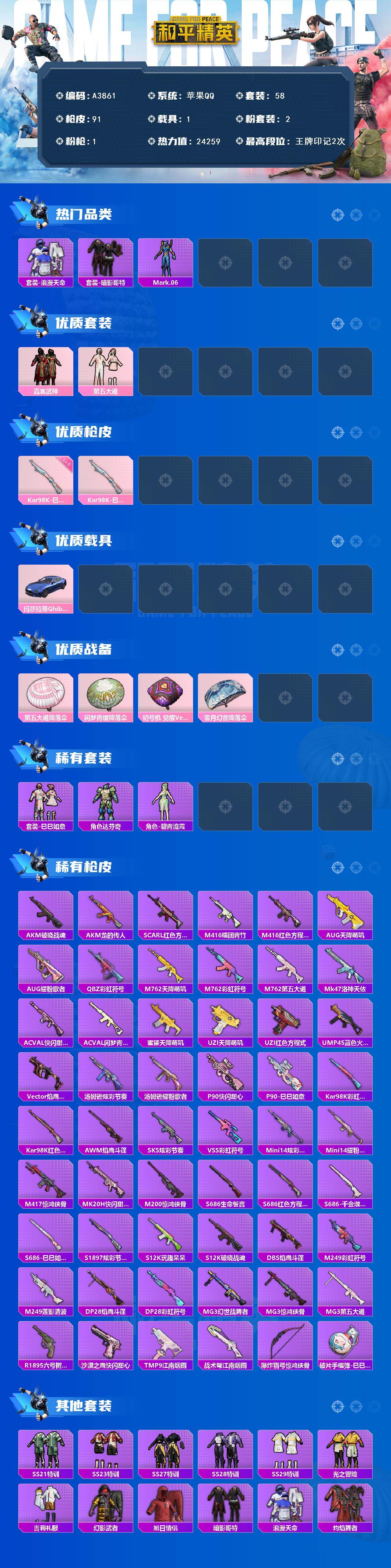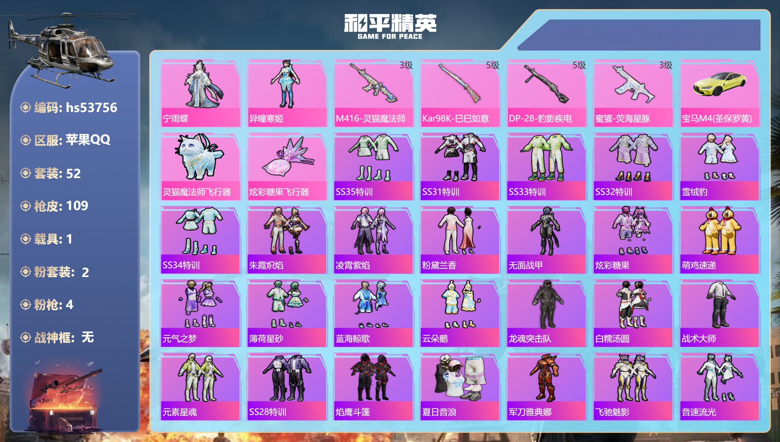 hs53756 苹果手Q-2王牌印记-2粉装-4特效枪-1载具-27951热力值-52套装-109枪