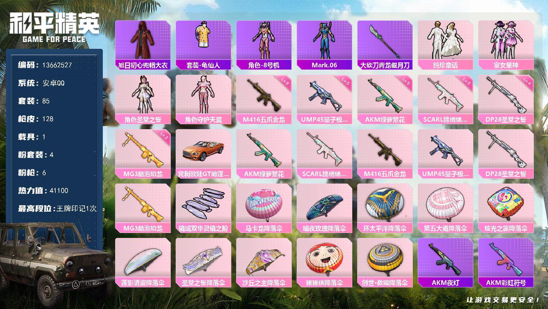 85套装/枪械6/装备163/载具1/战备87/王牌印记1/热力值41100/