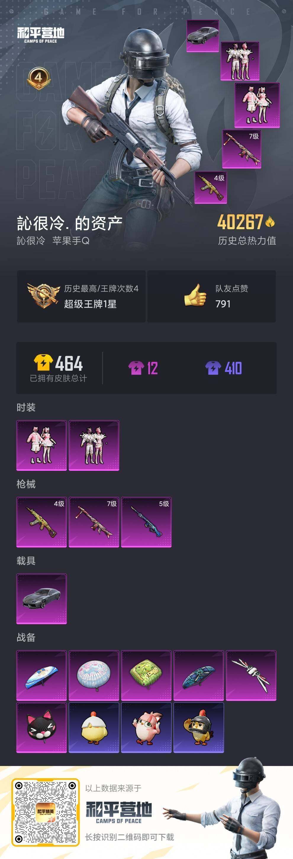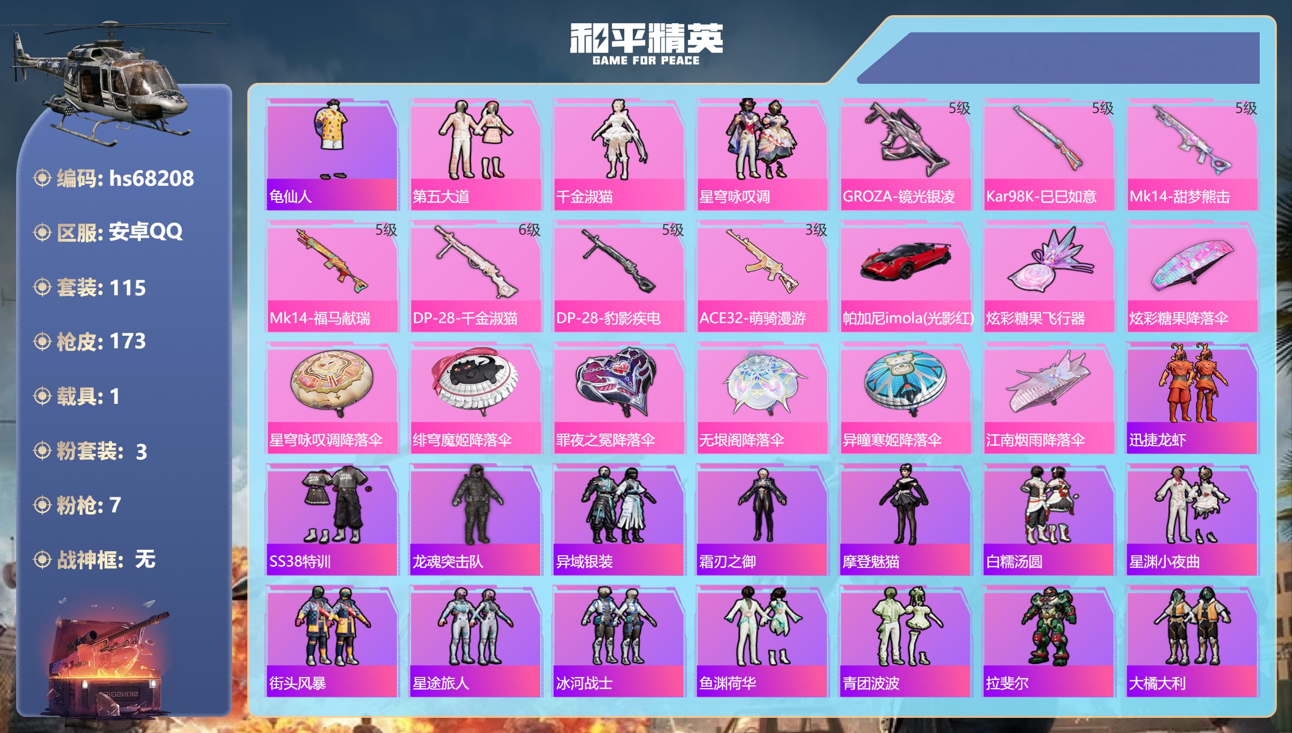 7王牌印记-3粉装-7特效枪-1载具-45649热力值-115套装-173枪皮-1卓越印记