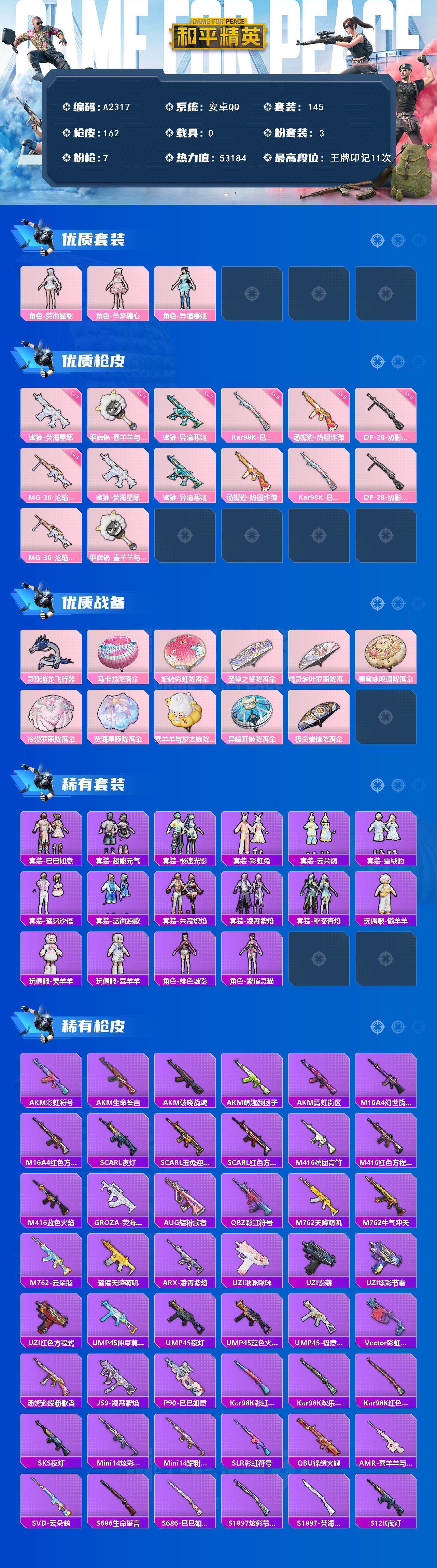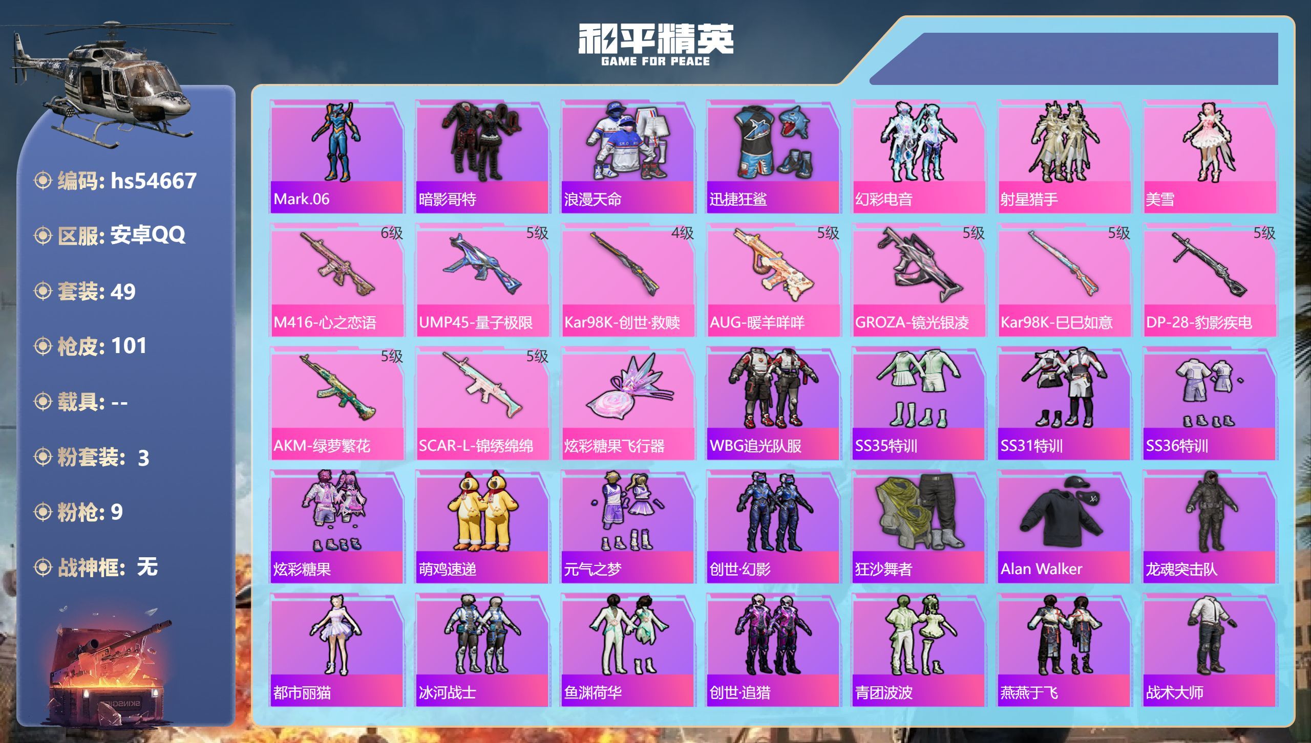 hs54667 安卓手Q-3王牌印记-3粉装-9特效枪-29602热力值-49套装-101枪皮【3粉
