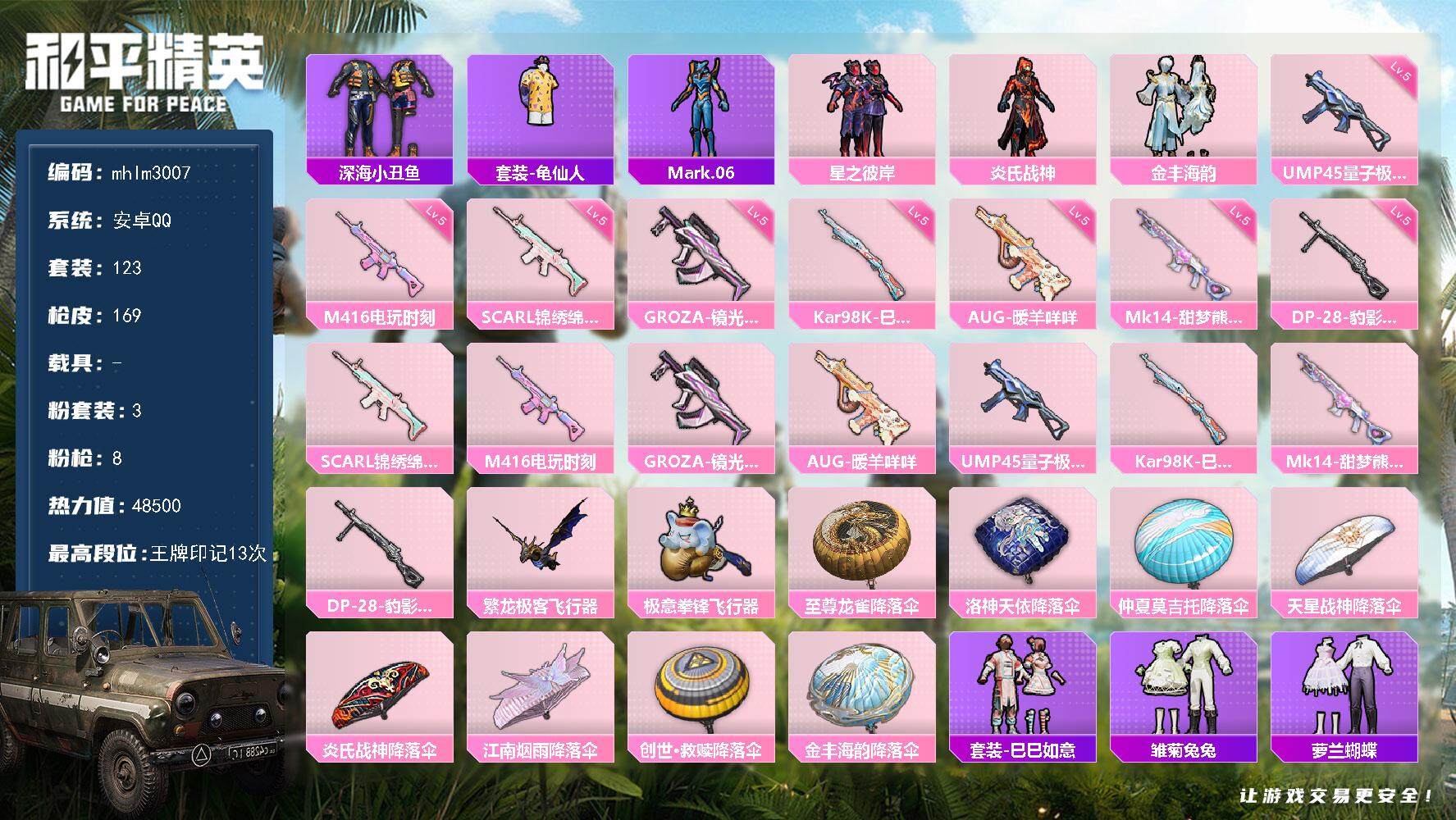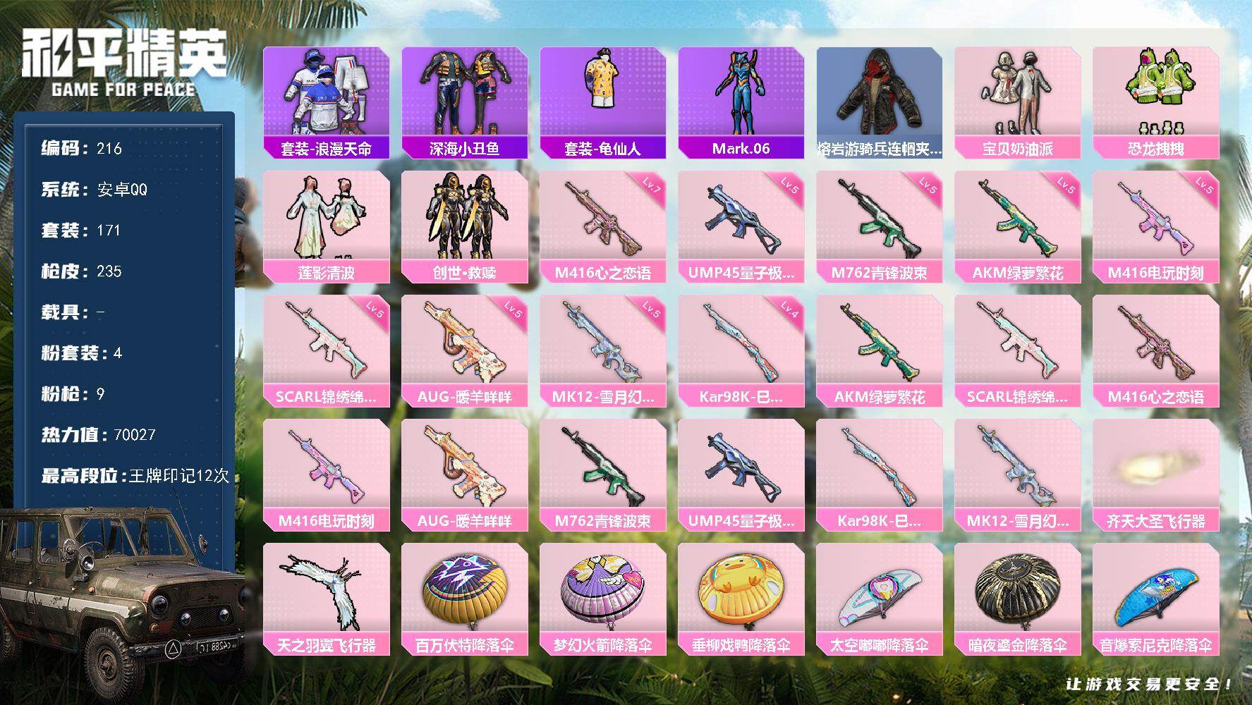 安卓 手Q-4粉装-9特效枪-0载具-2粉色飞行器-70027热力值-12王牌