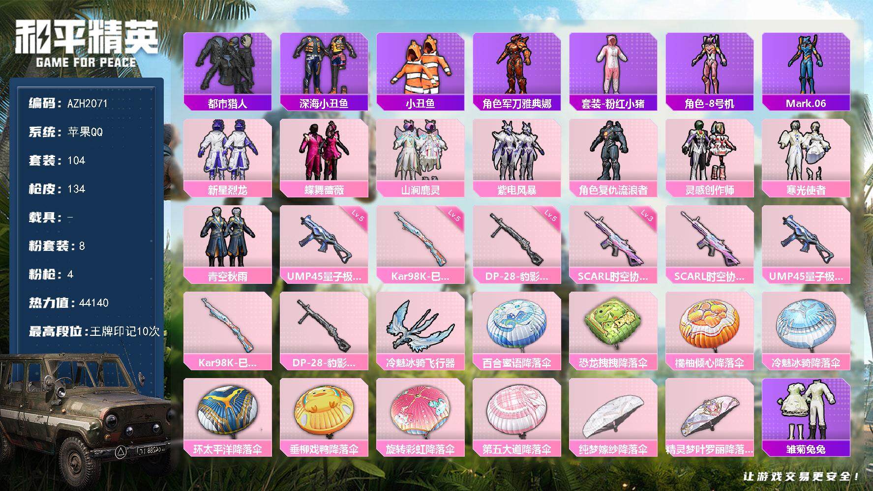 苹果 手Q-3粉装-5特效枪-0载具-1粉色飞行器-65902热力值-10王牌