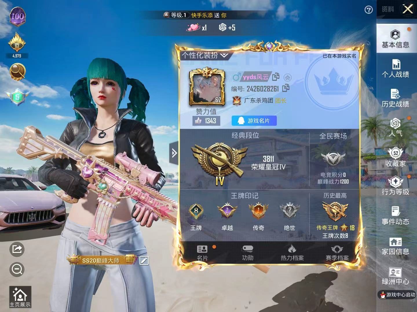 安卓 手Q-5粉装-4特效枪-0载具-3粉色飞行器-49830热力值-6王牌印