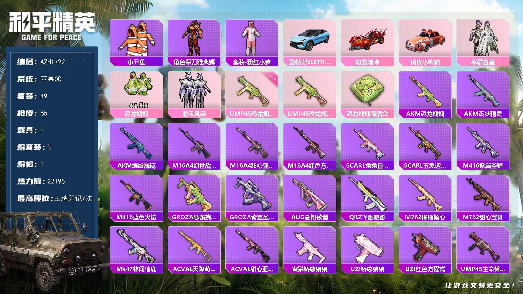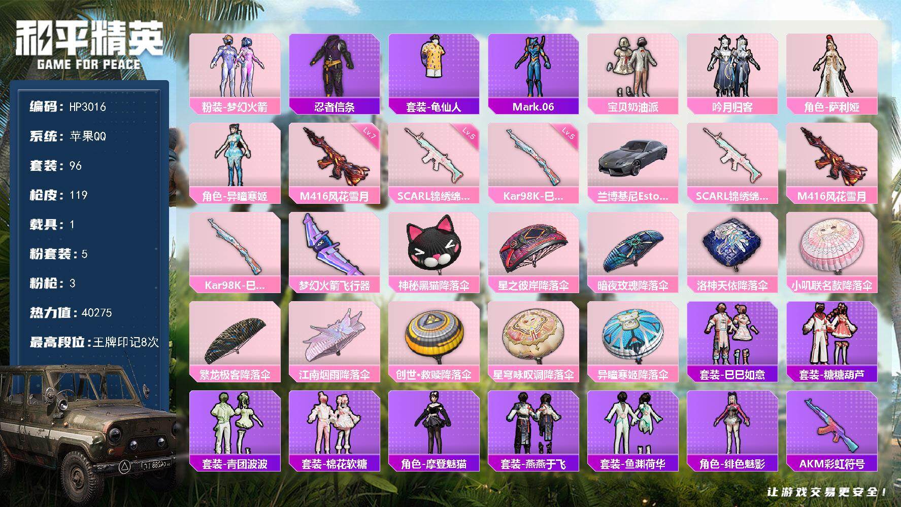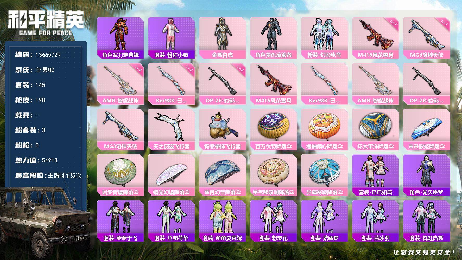 苹果手Q-5王牌印记-3粉装-3特效枪-2载具-36716热力值-106套装-108枪皮-1卓越印记