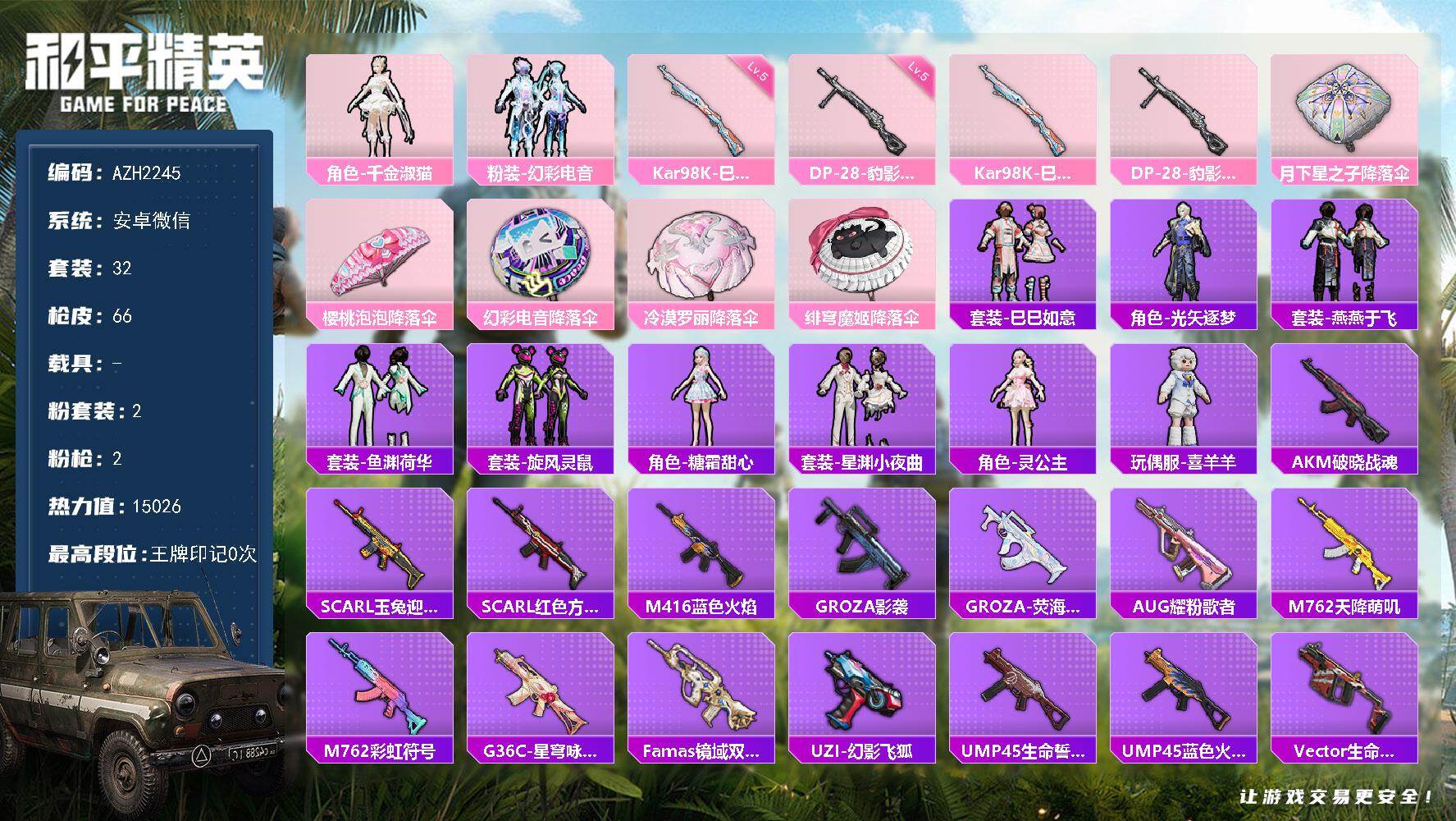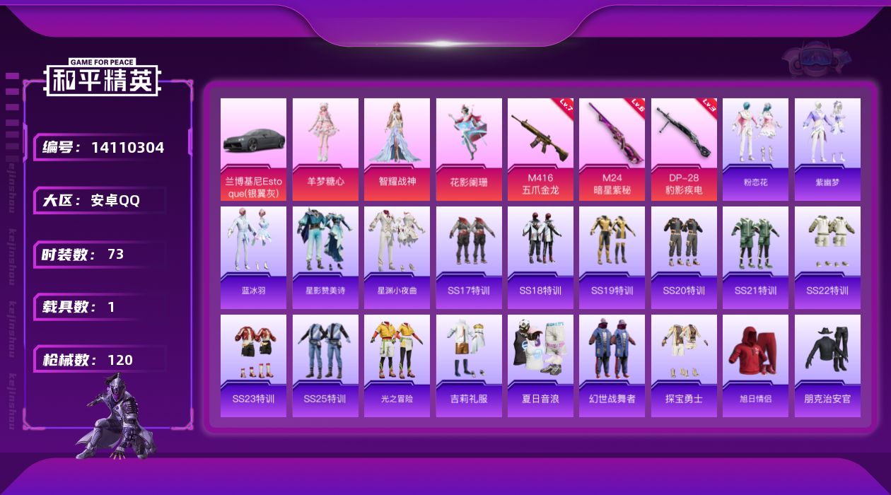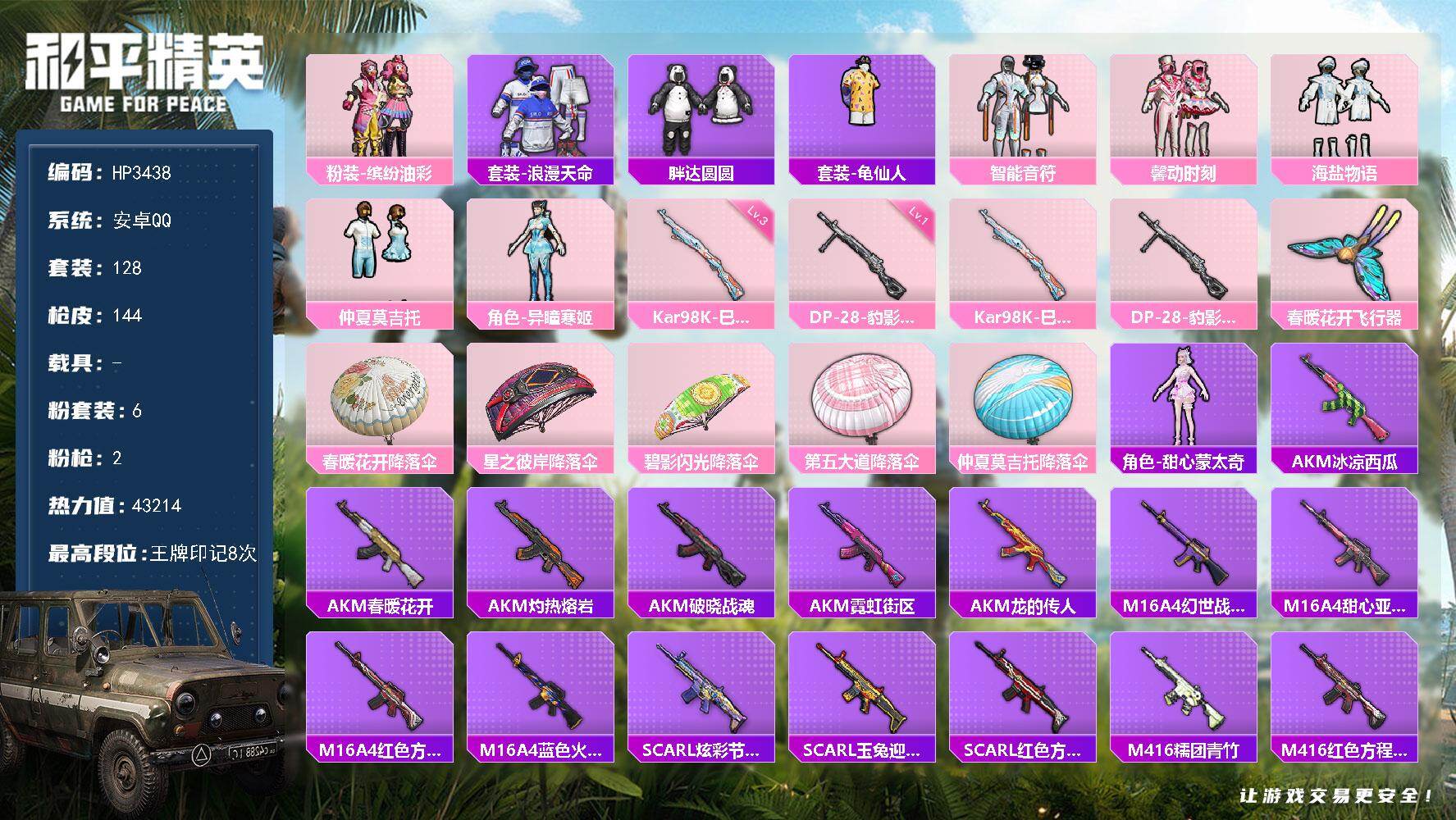 a4018/安卓QQ/-0王牌印记-3粉装-4特效枪-1载具-18716热力值-28套装-63枪皮-