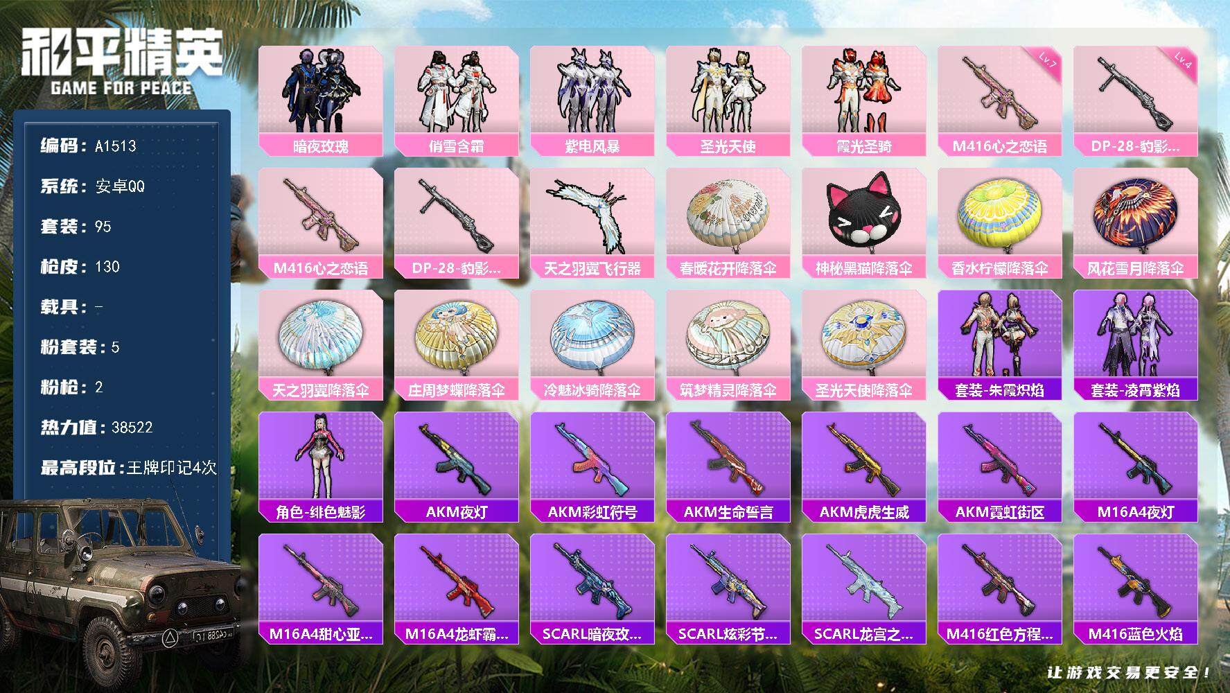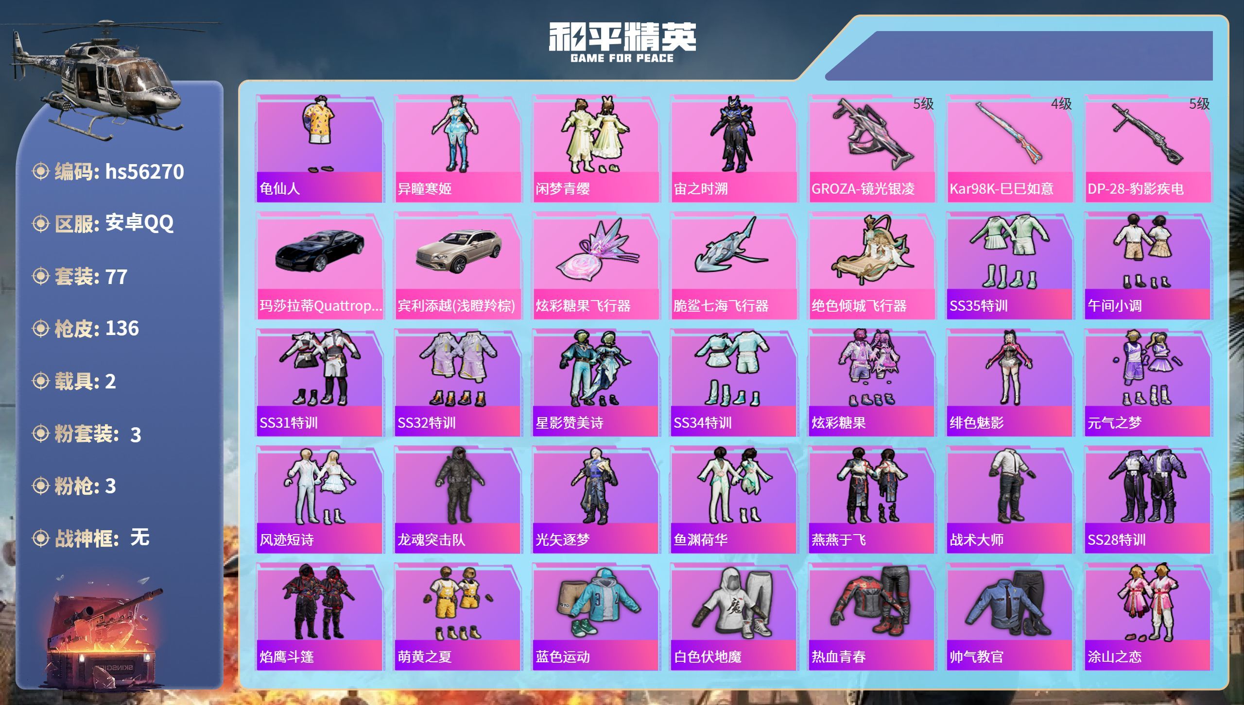 hs56270 安卓手Q-4王牌印记-3粉装-3特效枪-2载具-40293热力值-77套装-136枪