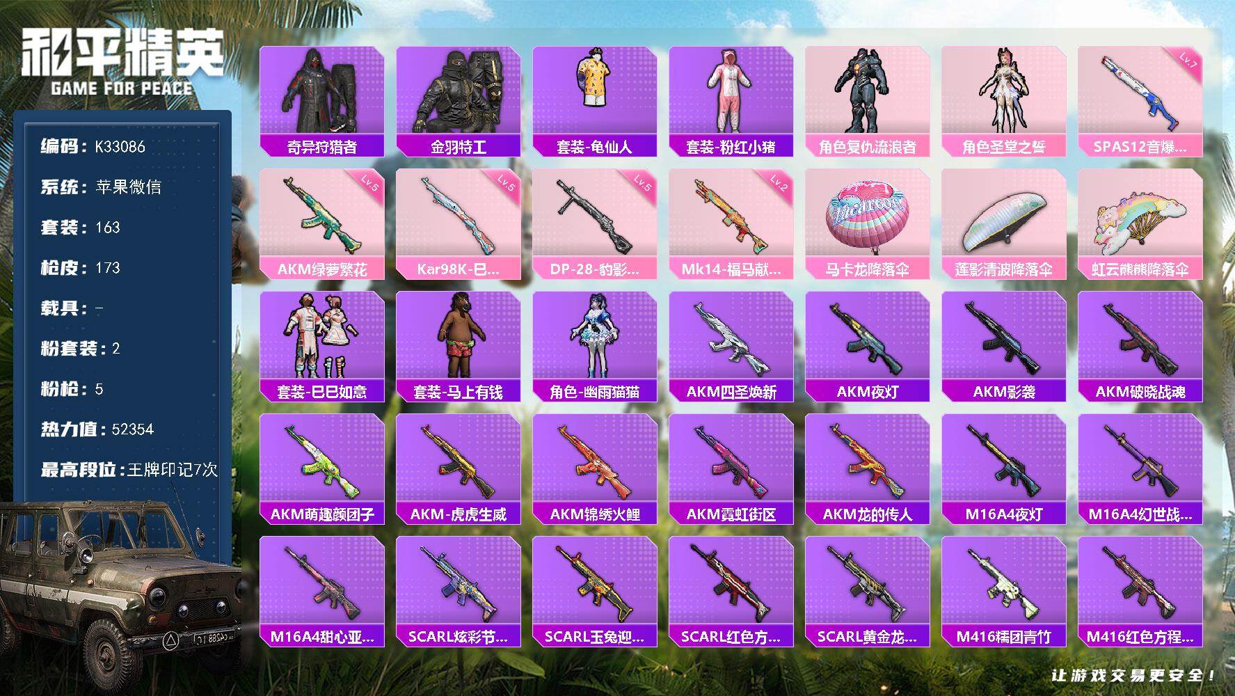苹果 微信-2粉装-5特效枪-0载具-0粉色飞行器-52354热力值-7王牌印记