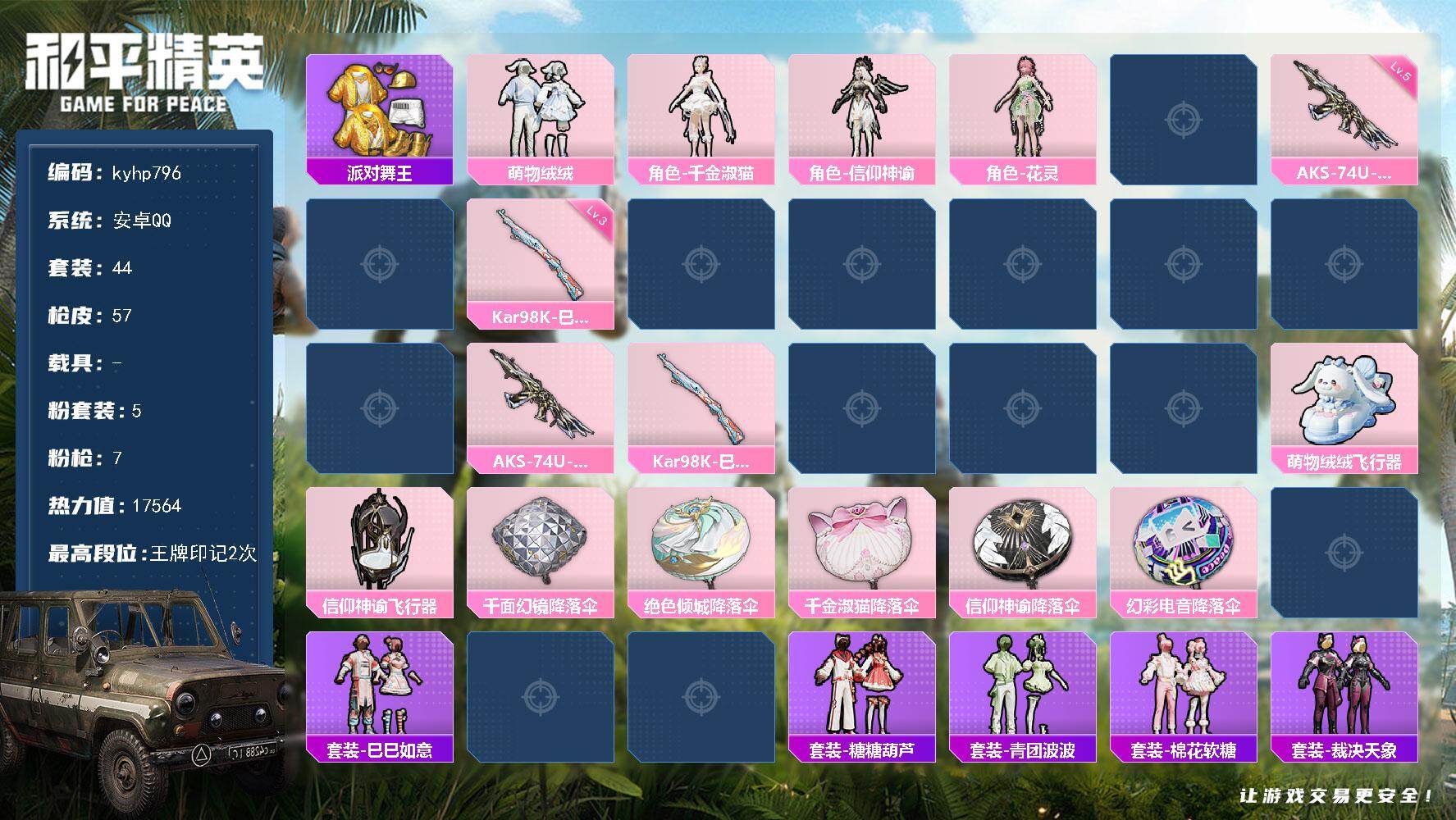 安卓 手Q-5粉装-7特效枪-0载具-2粉色飞行器-17564热力值-2王牌印