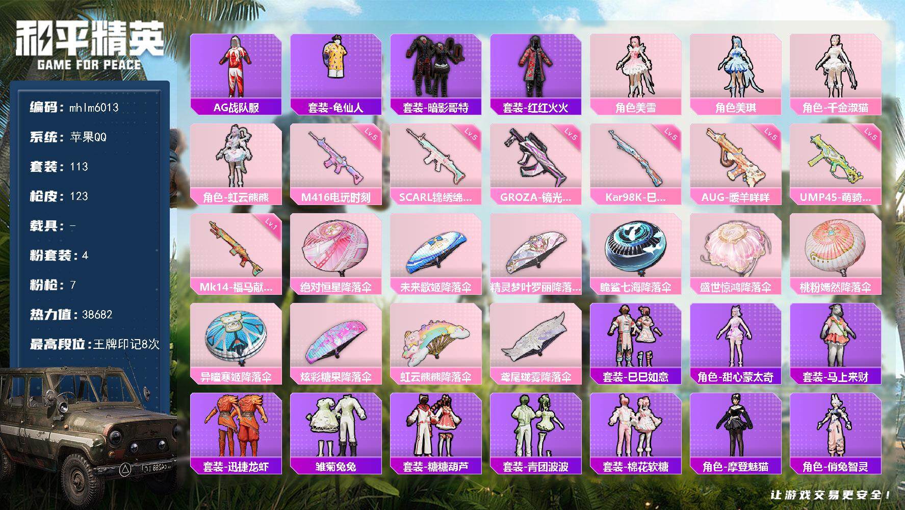 3王牌印记-2粉装-4特效枪-1载具-30323热力值-68套装-102枪皮-1卓越印记