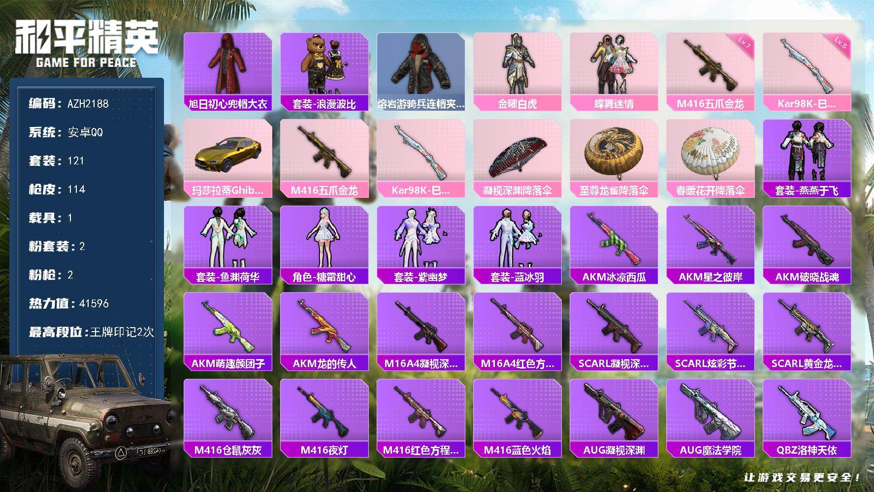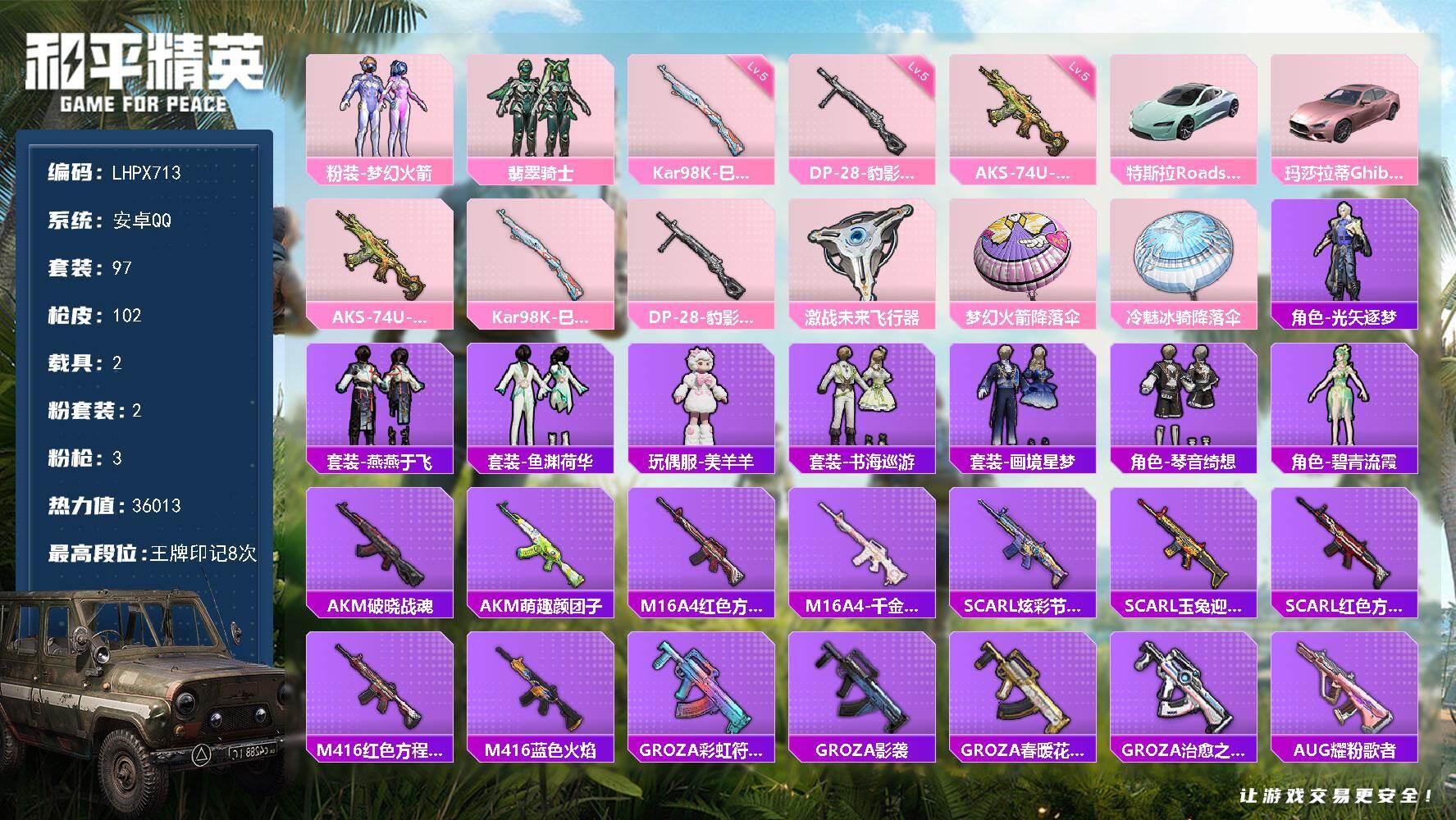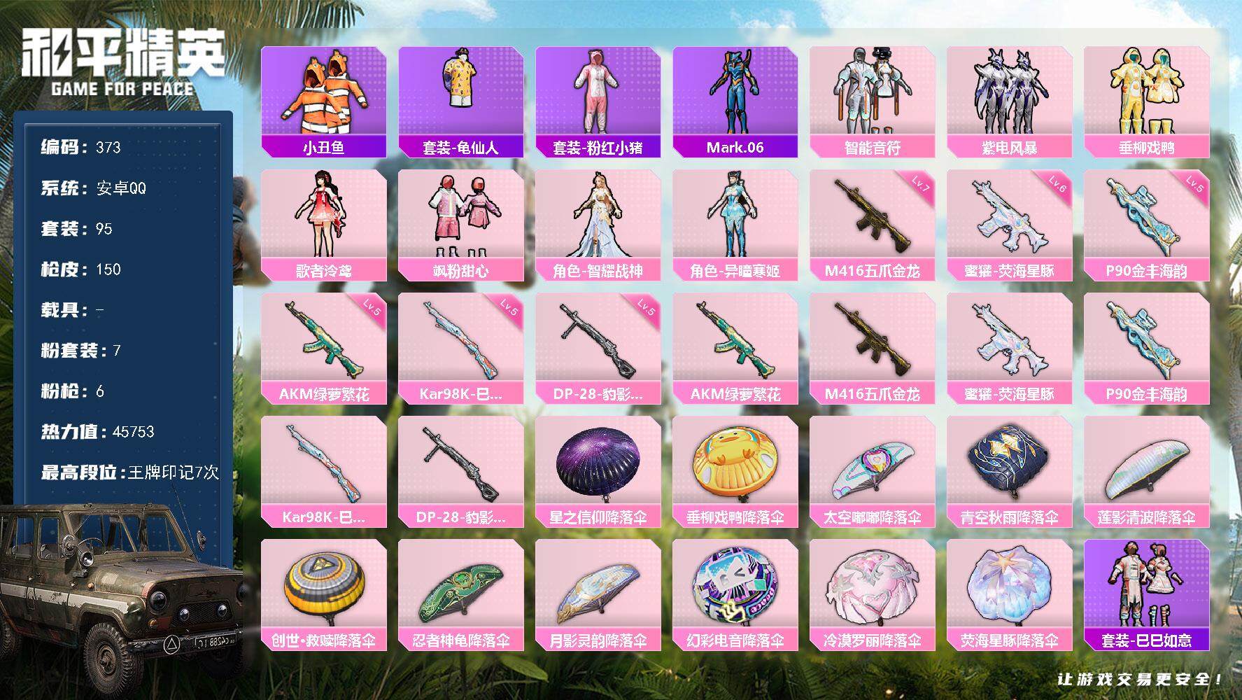 安卓 手Q-7粉装-6特效枪-0载具-0粉色飞行器-45753热力值-7王牌印