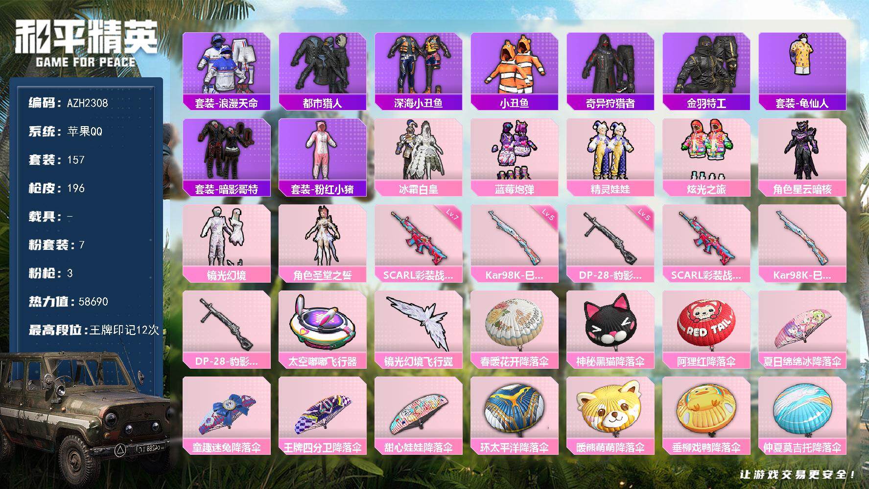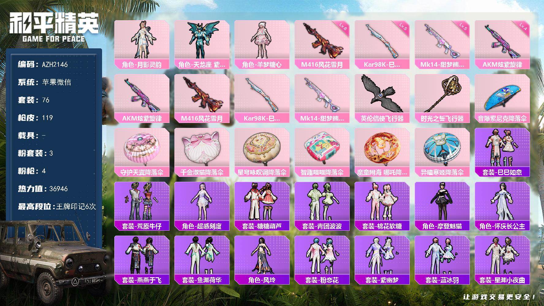 苹果 手Q-6粉装-4特效枪-1载具-1粉色飞行器-63606热力值-12王牌