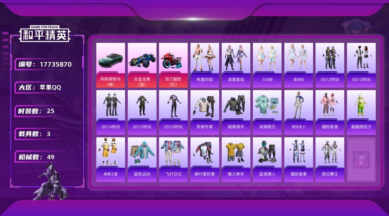 苹果手Q-2王牌印记-1粉装-3特效枪-1载具-9362热力值-