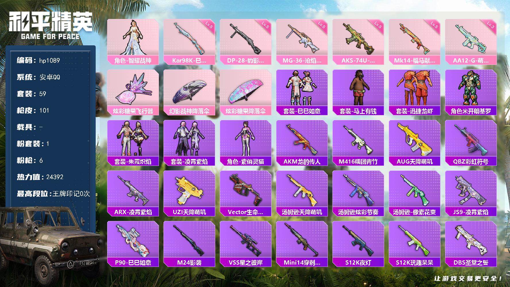 安卓 手Q-1粉装-6特效枪-0载具-1粉色飞行器-24392热力值-1王牌印