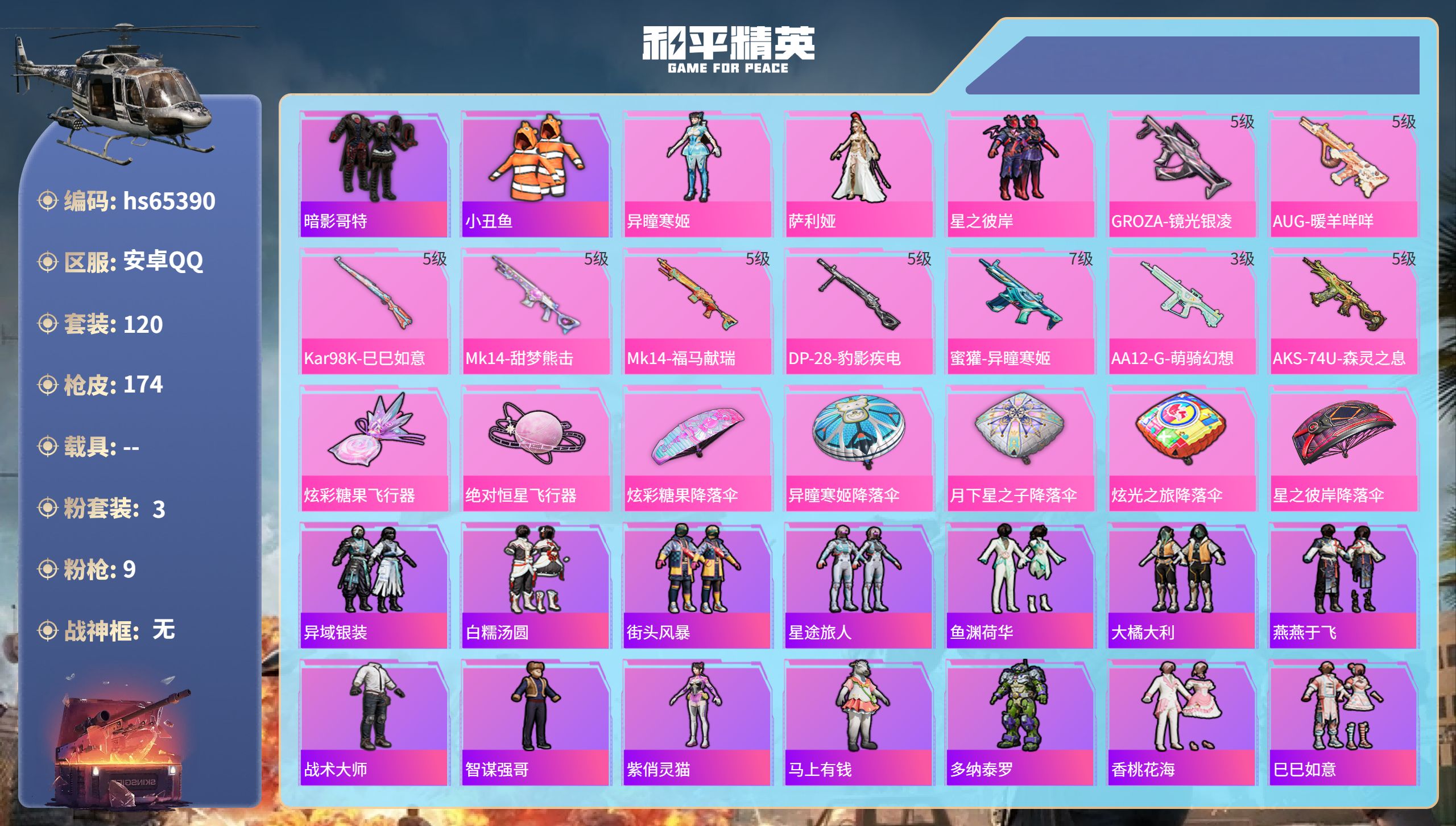 安卓 手Q-2粉装-6特效枪-0载具-1粉色飞行器-62989热力值-9王牌印记