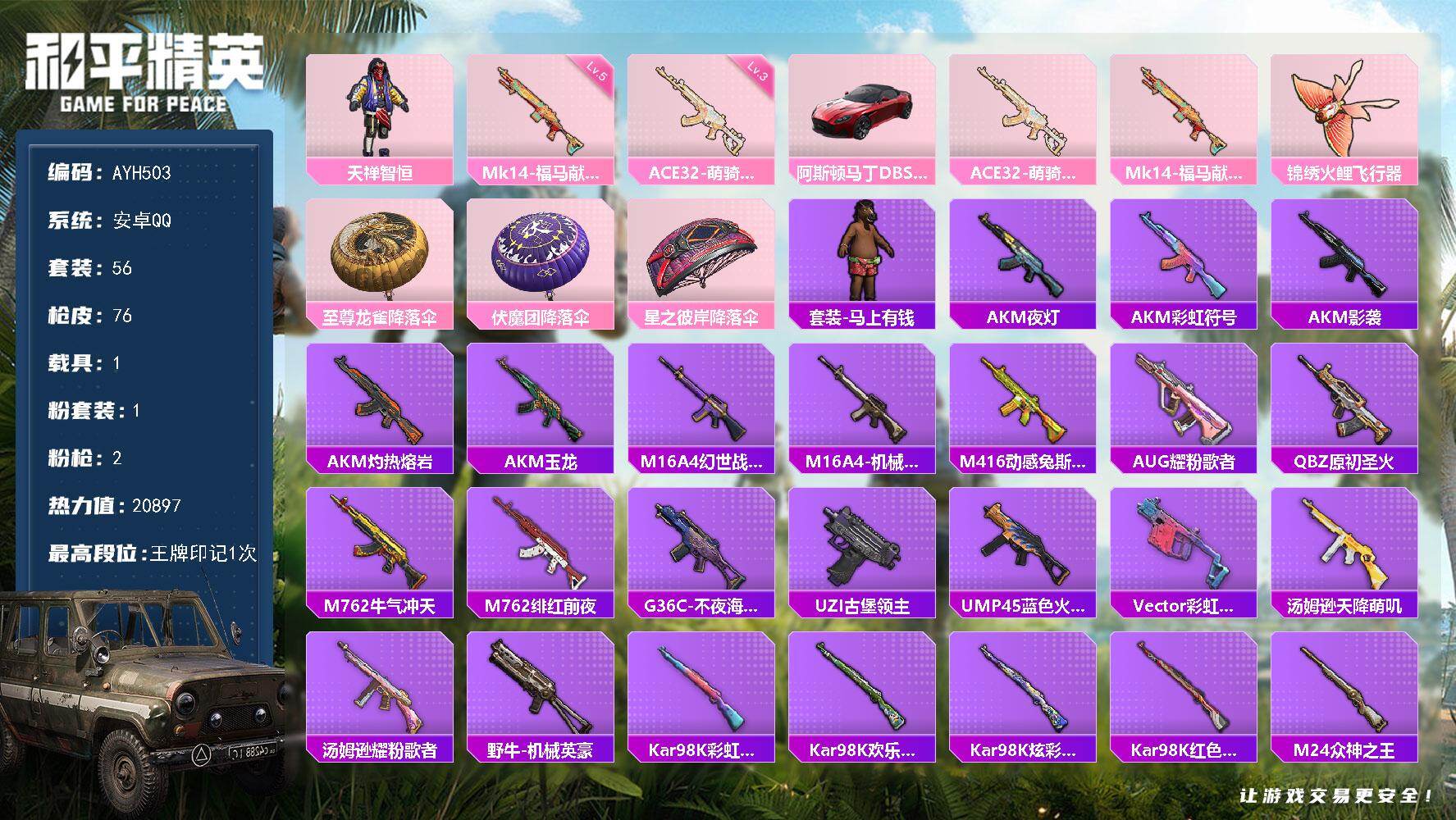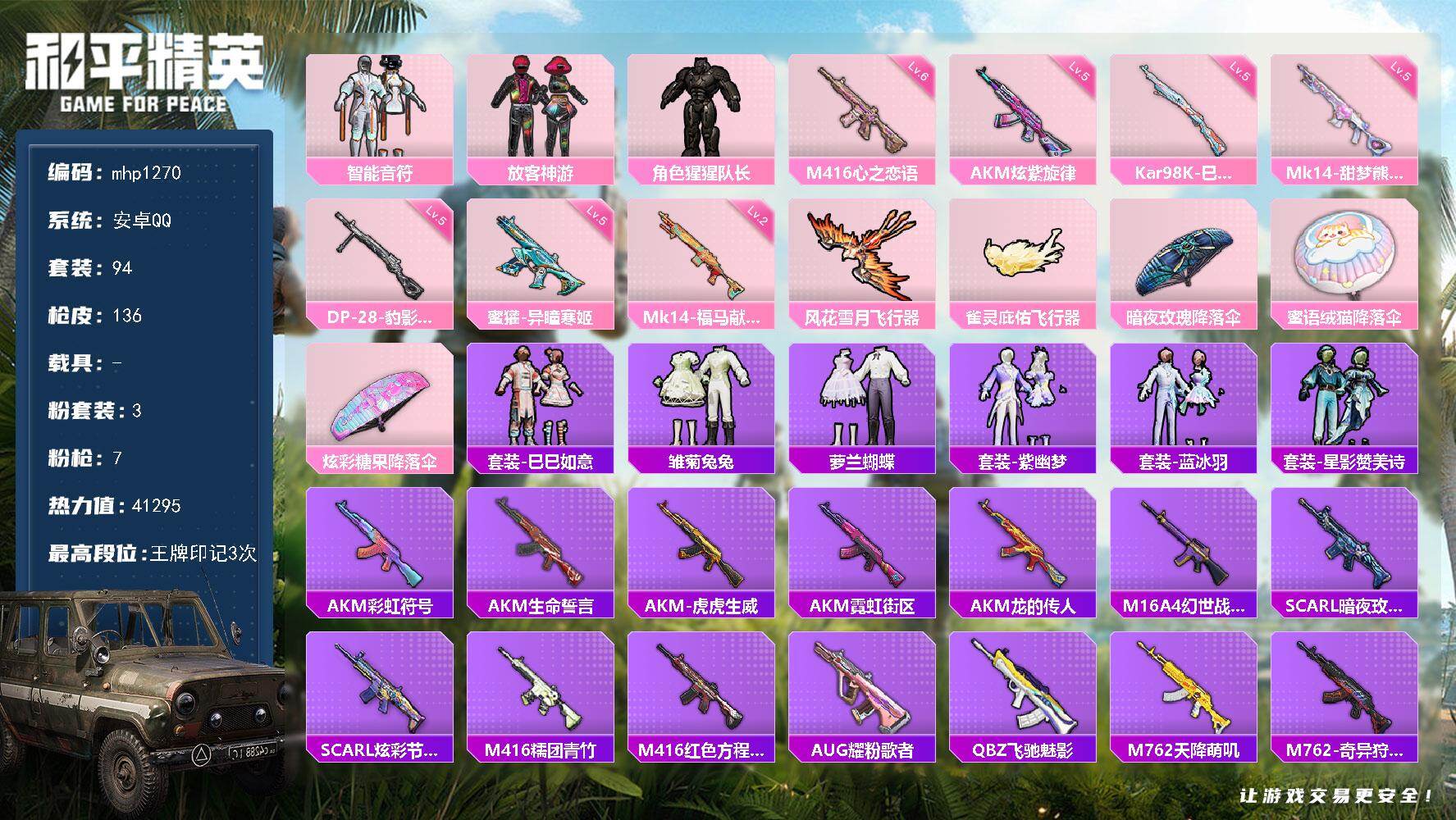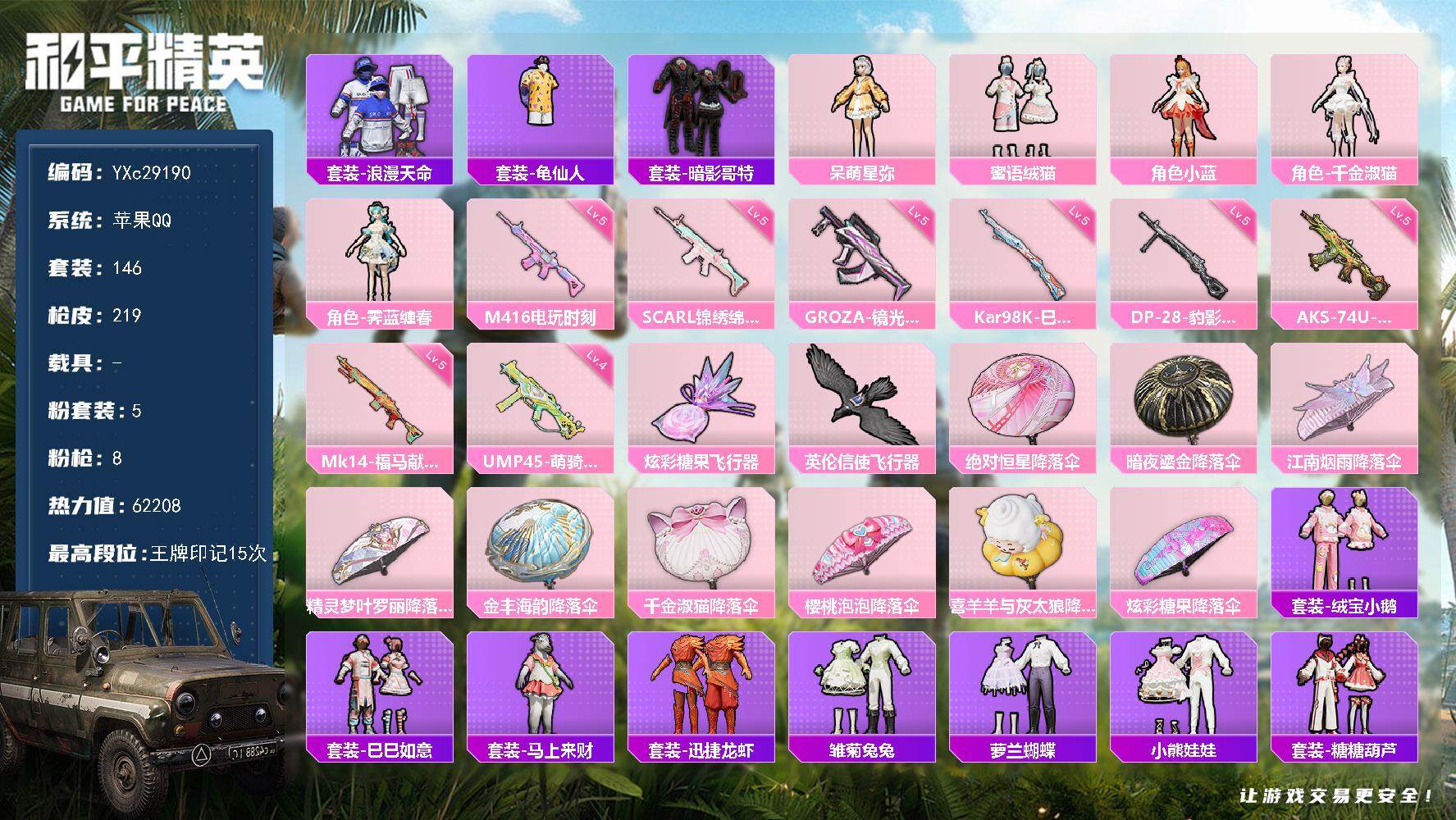 0粉装-0特效枪-0载具-0粉色飞行器-22314热力值-1王牌印记-62套装-94枪皮