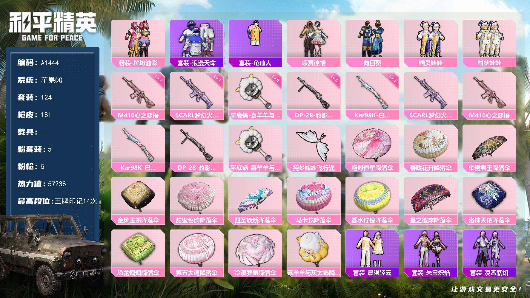 5粉装-5特效枪-0载具-2粉色飞行器-57238热力值-14王牌印记-124套装-181枪皮