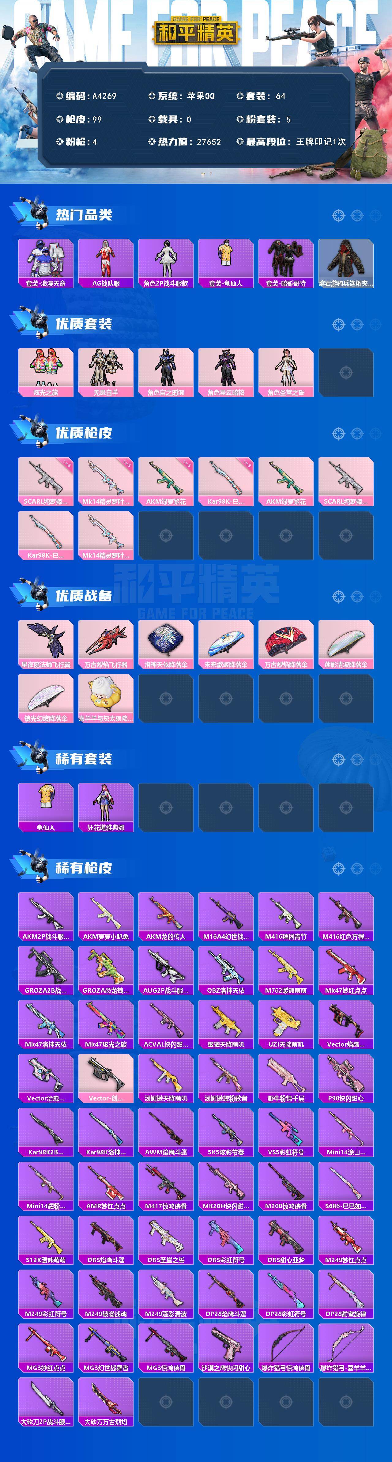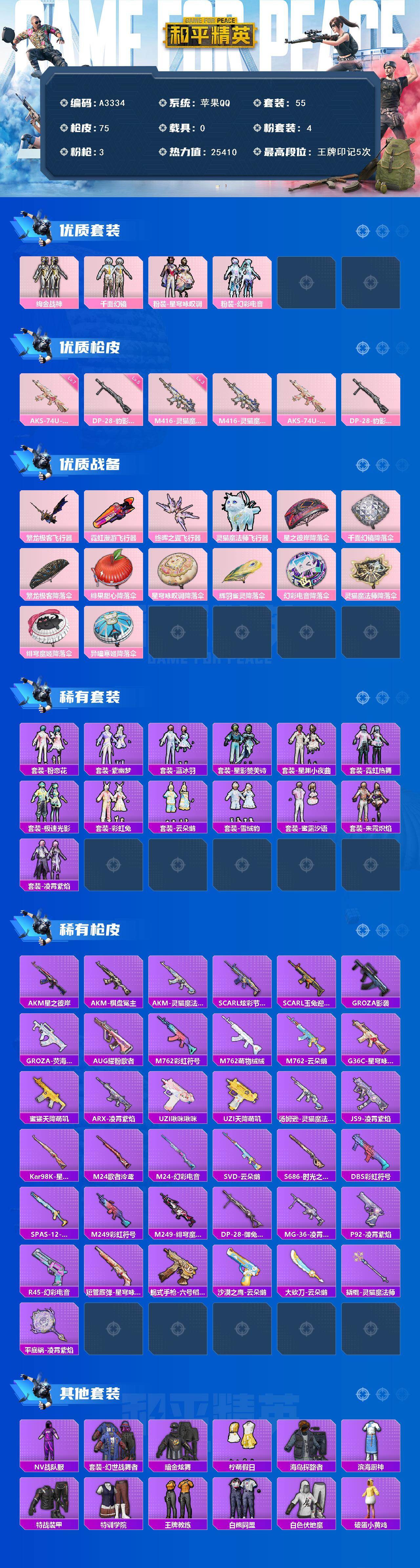 M102417【3载具1粉装3特效枪】苹果Q-43847热力值 5王牌印记 历史超级王牌8星 125