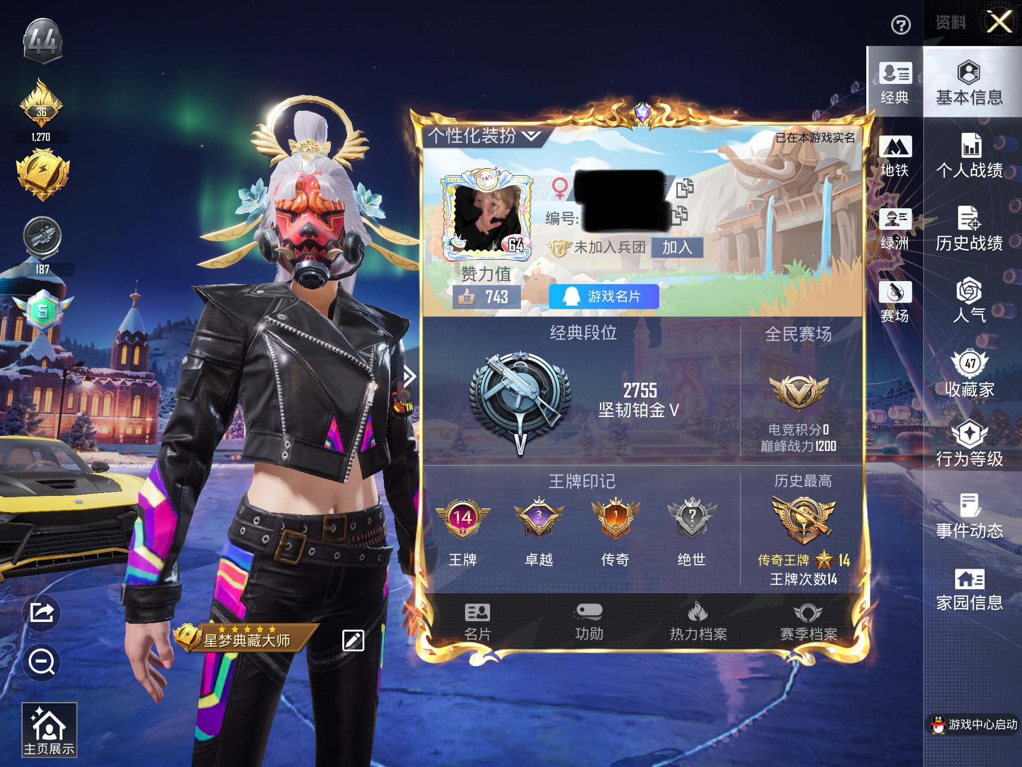 实名: 可修改 时装数: 42 枪械数: 74 战备数: 63 热门装扮: 洛