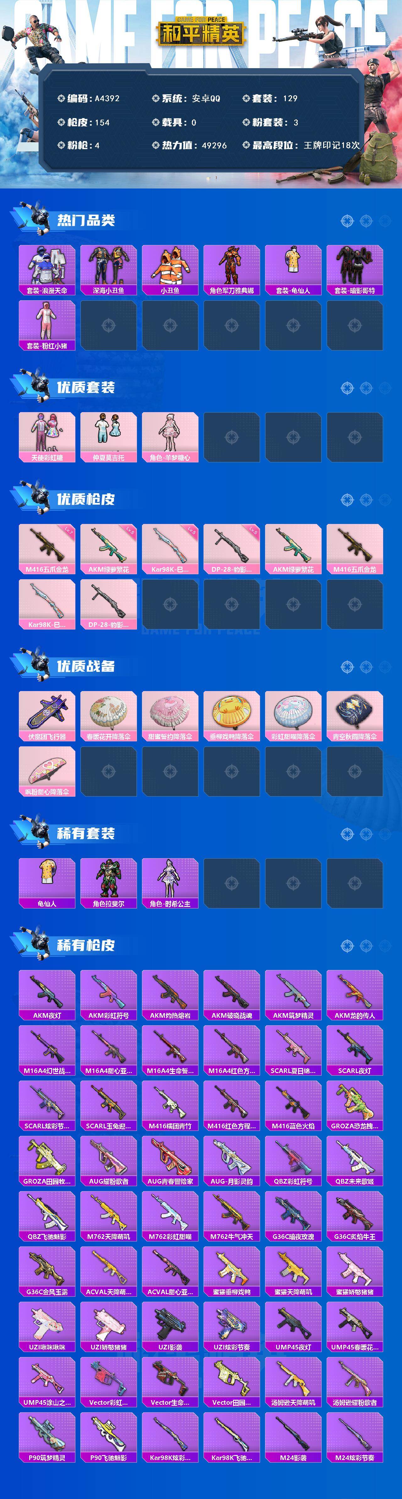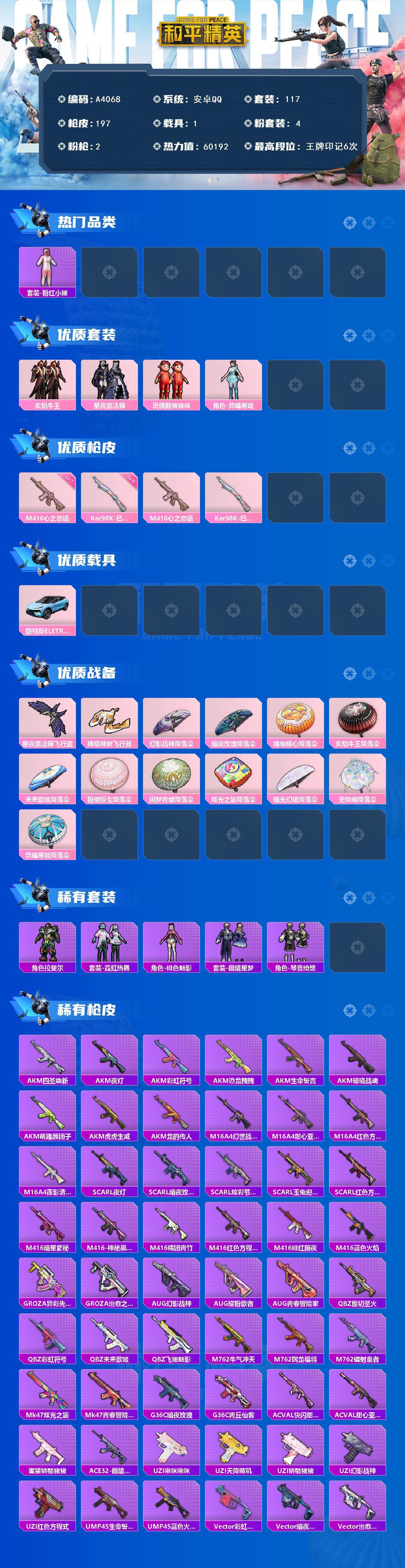 hs50791 安卓手Q-6王牌印记-6粉装-2特效枪-1载具-29699热力值-65套装-86枪皮