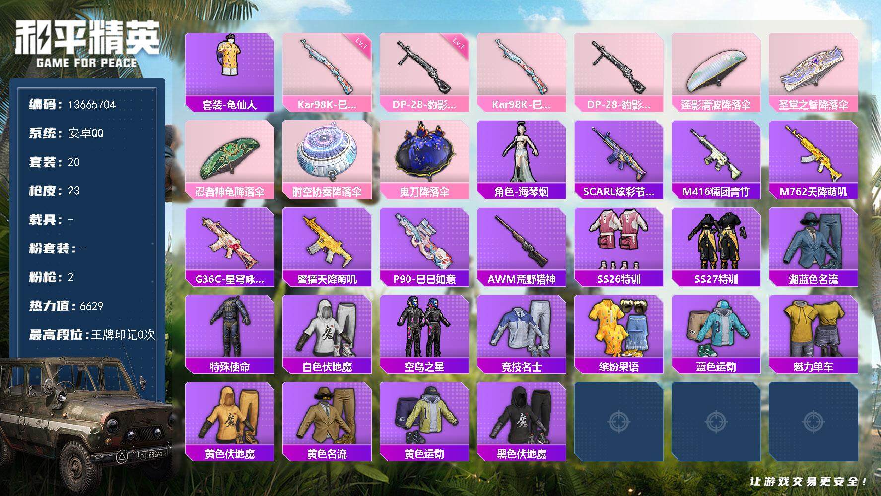 【商品标题】:安卓 手Q-0粉装-2特效枪-0载具-3661热力值--2印记-