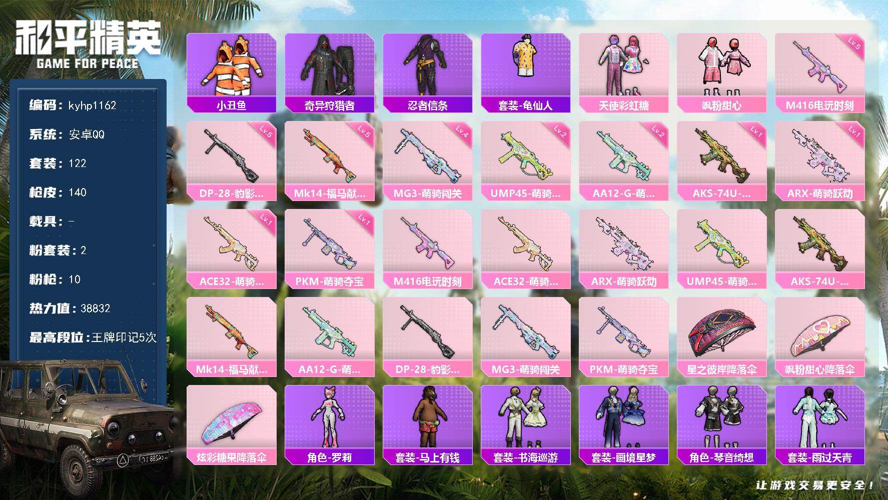 安卓 手Q-2粉装-10特效枪-0载具-0粉色飞行器-38832热力值-5王牌