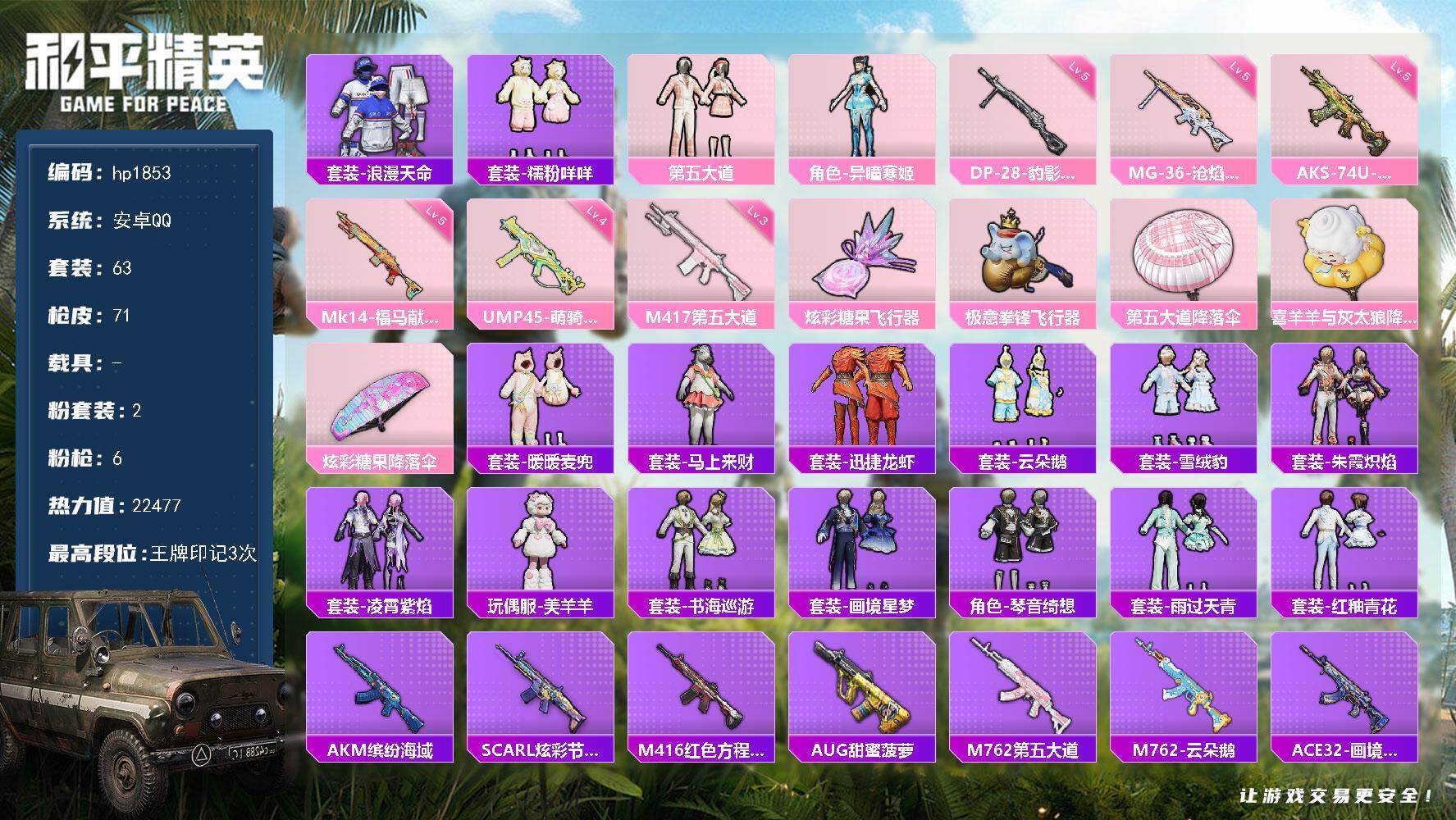 安卓 手Q-2粉装-6特效枪-0载具-2粉色飞行器-22477热力值-3王牌印