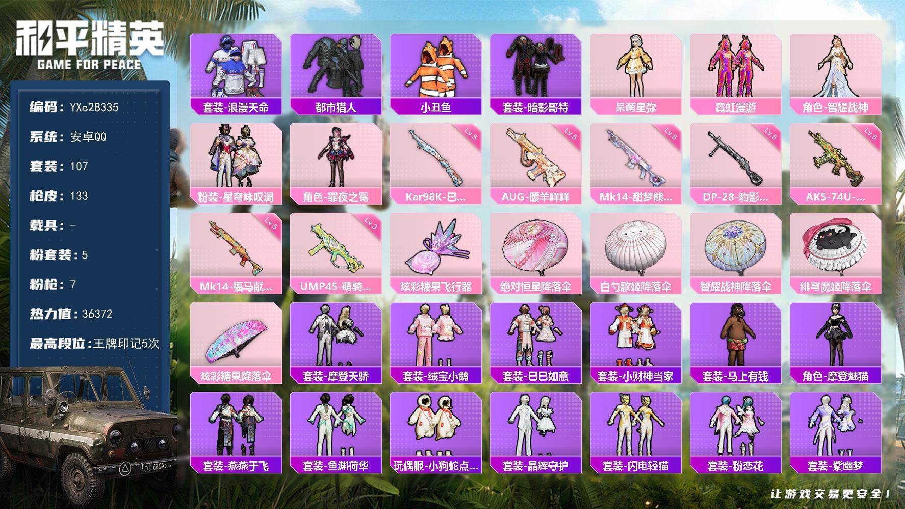 安卓 手Q-5粉装-2特效枪-1载具-1粉色飞行器-39038热力值-7王牌印