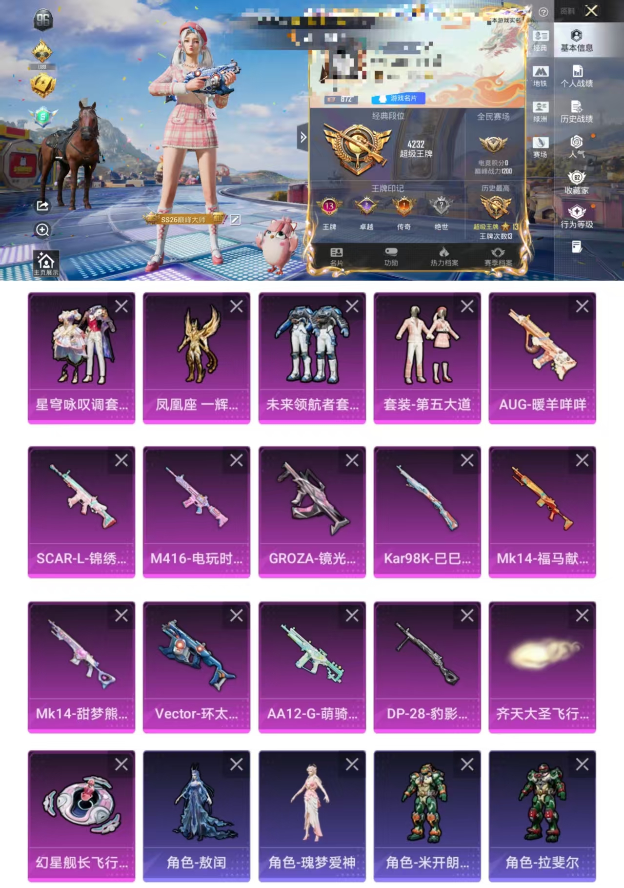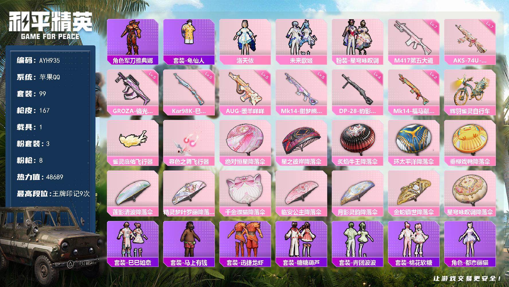 苹果 手Q-3粉装-8特效枪-1载具-2粉色飞行器-48689热力值-9王牌印