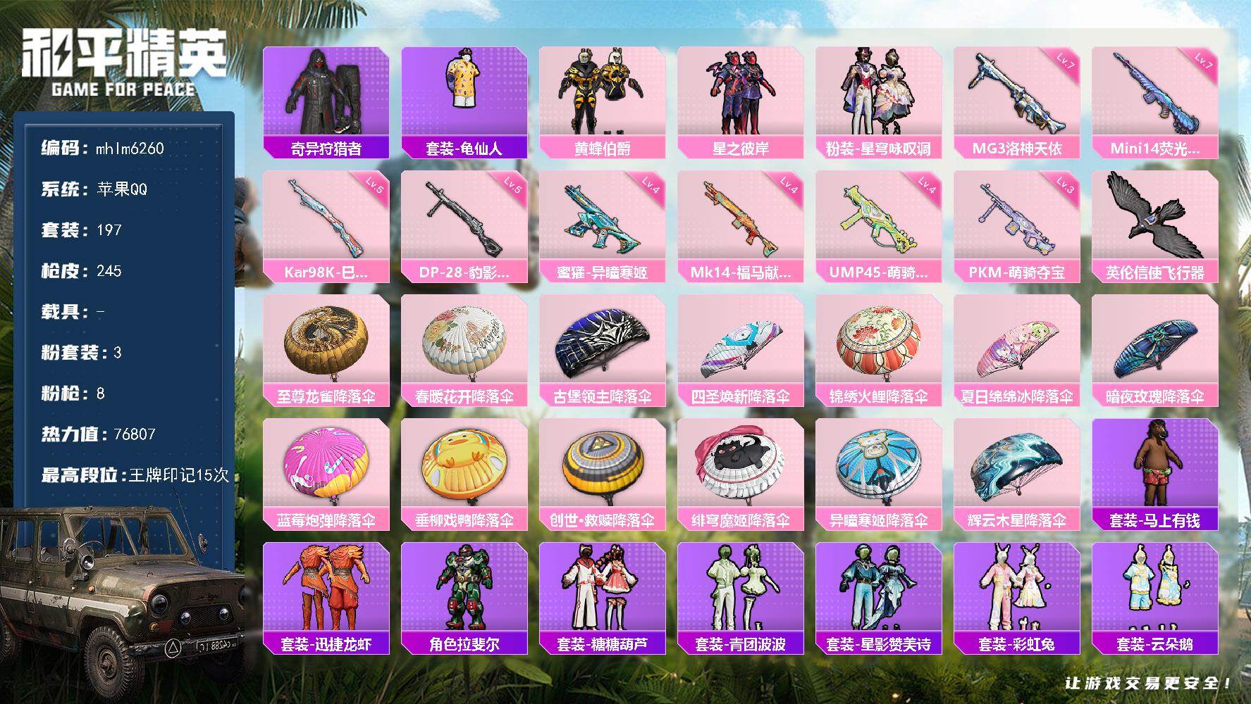苹果 手Q-3粉装-8特效枪-0载具-1粉色飞行器-76807热力值-15王牌印