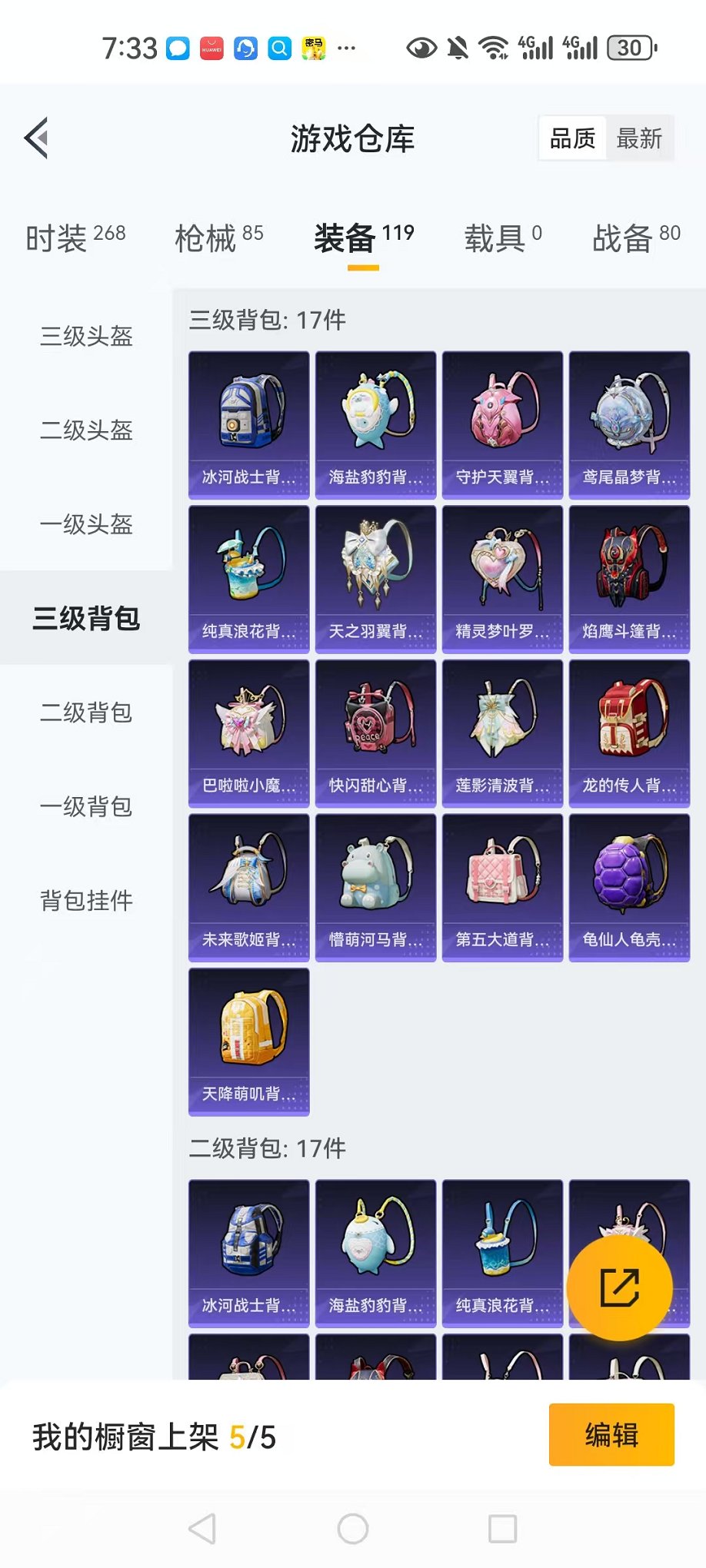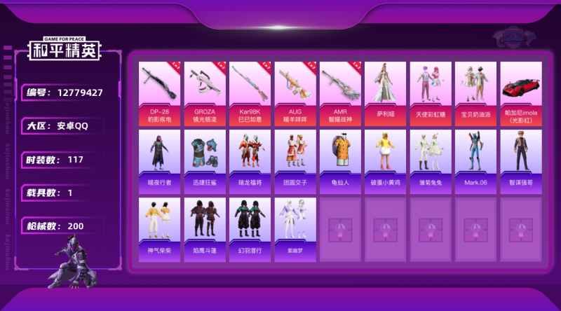 安卓Q-1稀有2载具4粉装3特效枪10热门145套装169枪皮 10印记 历史卓越王牌9星