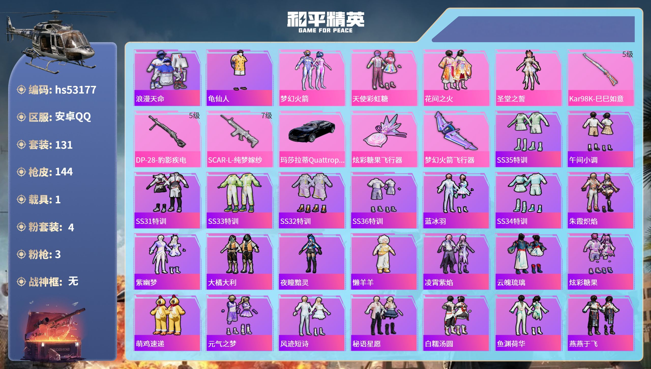 hs53177 安卓手Q-5王牌印记-4粉装-3特效枪-1载具-45352热力值-131套装-144