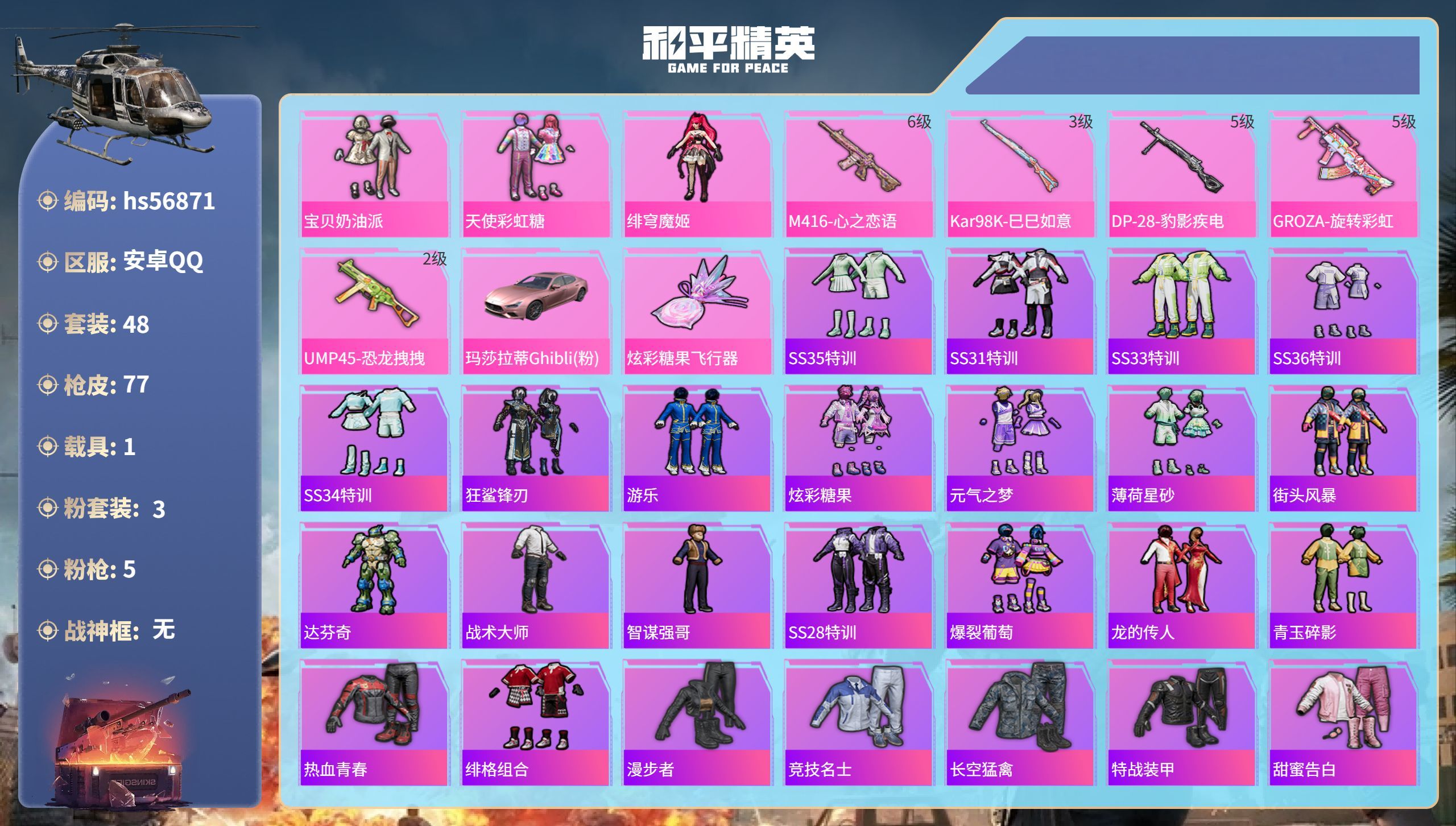 hs56871安卓手Q-2王牌印记-3粉装-5特效枪-1载具-24493热力值-48套装-77枪皮-