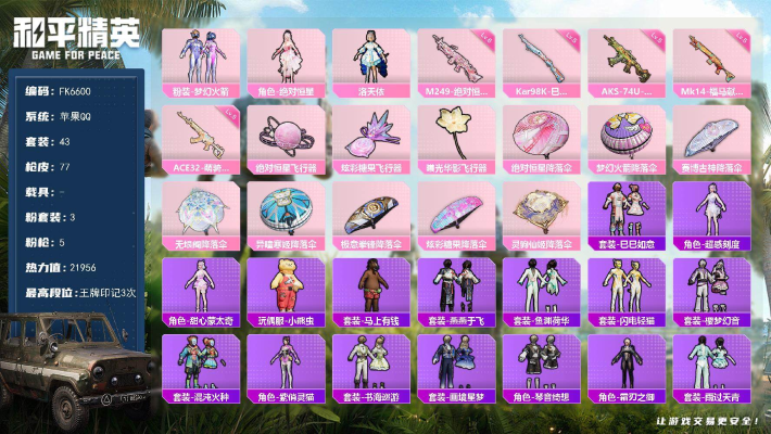 苹果 手Q-5粉装-6特效枪-0载具-1粉色飞行器-56000热力值-6王牌印