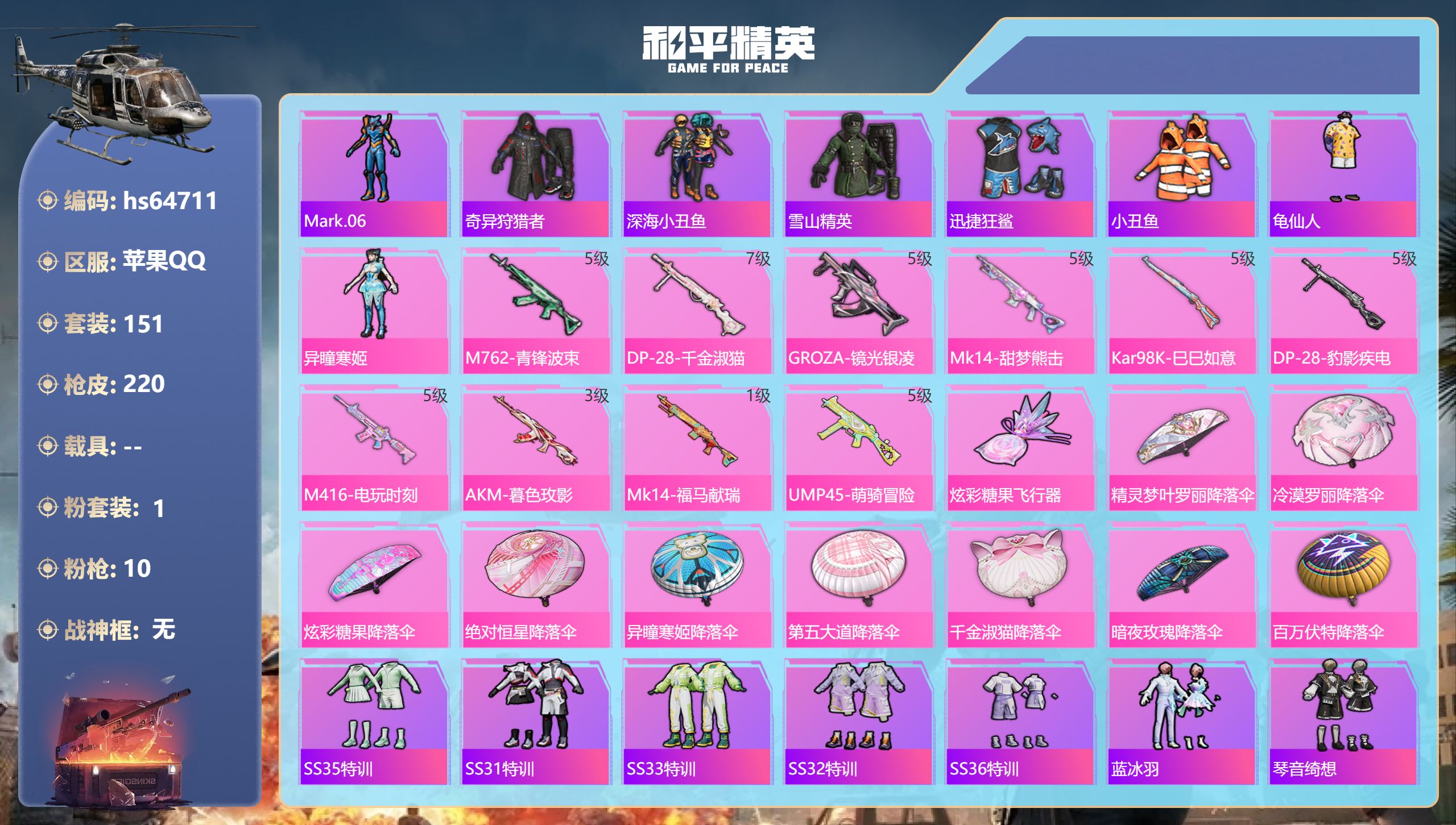 9王牌印记-1粉装-10特效枪-66040热力值-151套装-220枪皮-2卓越印记