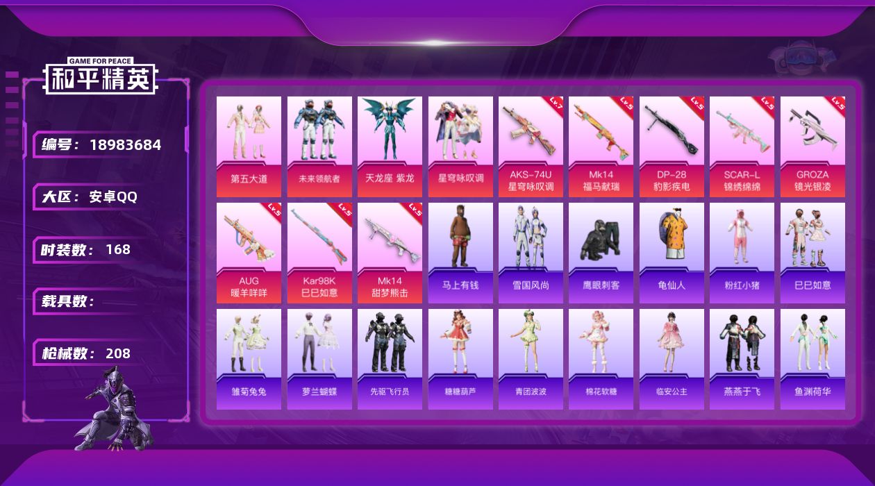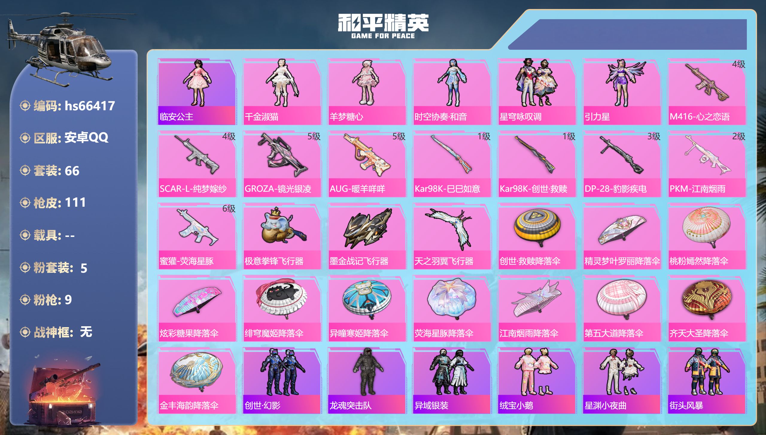 安卓 手Q-2粉装-7特效枪-0载具-1粉色飞行器-68466热力值-13王牌