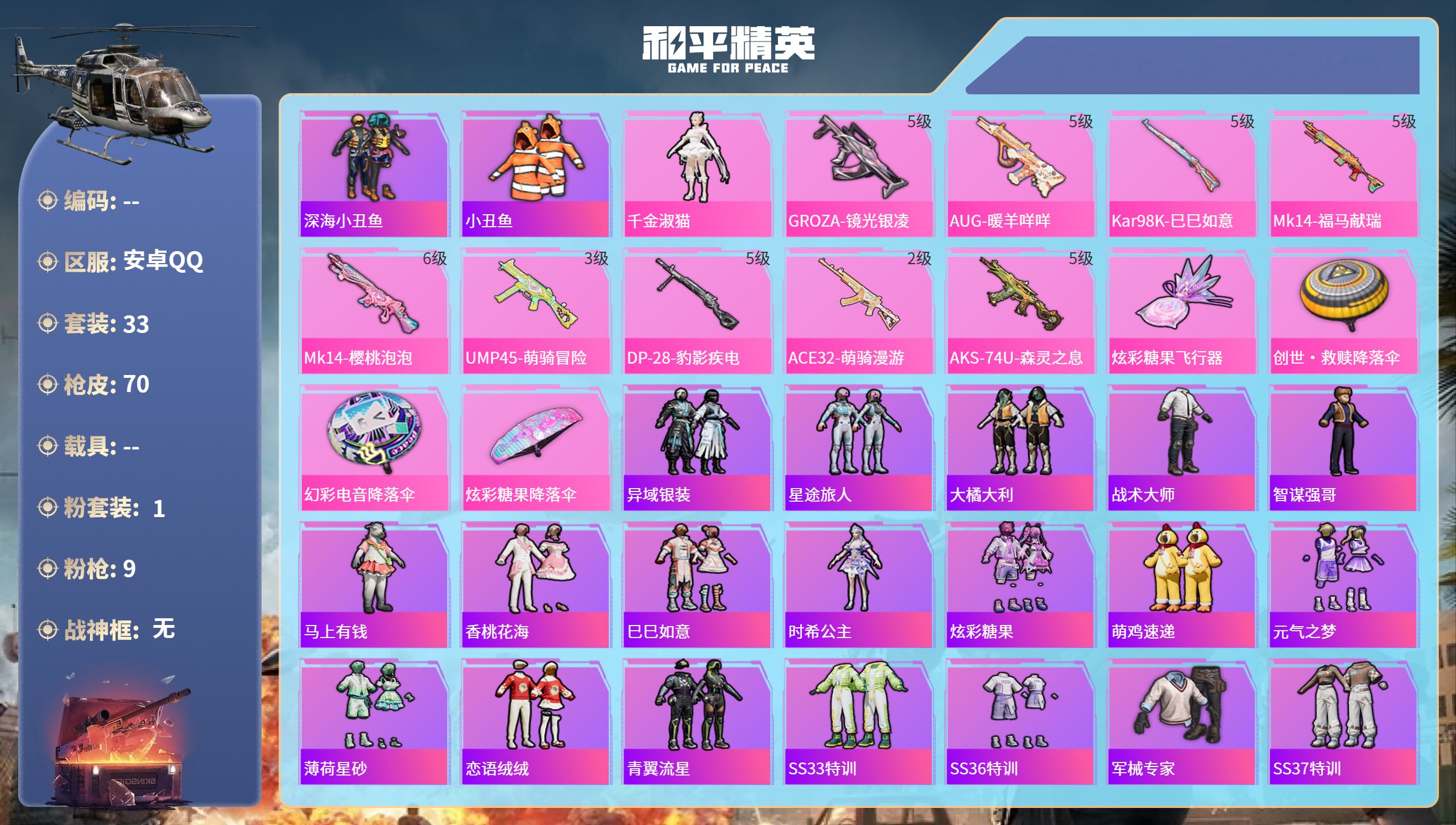 0王牌印记-1粉装-9特效枪-19032热力值-33套装-70枪皮
